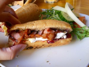 This was my first time trying Aspall, a delicious British cider. We also had some very yummy baguette sandwiches! I got a bacon, Brie, and cranberry baguette, and Andrew got a steak & mushroom baguette. Mmmmm…they were so good!