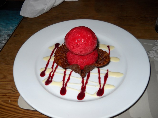 Our food ended up being amazing! Andrew & I both ordered salads before our main courses. His had apples and walnuts, and mine had black pudding and goat cheese. So good! My main course was bacon-wrapped chicken in a tasty whole grain mustard sauce. Andrew had seafood crepes. We then shared raspberry sorbet in sugar-spun bowls.
