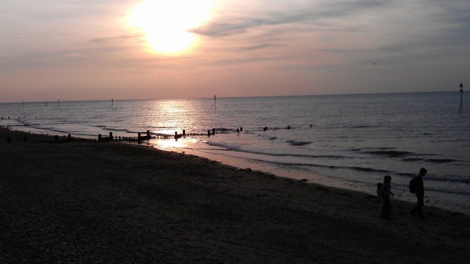 The beach I found when I did a search on my phone was about half an hour away. I’m sure there were closer ones (we passed signs for quite a few!), but I had directions to Hunstanton, so that’s where we headed! Our timing was perfect: we got to see the sun set on the ocean!