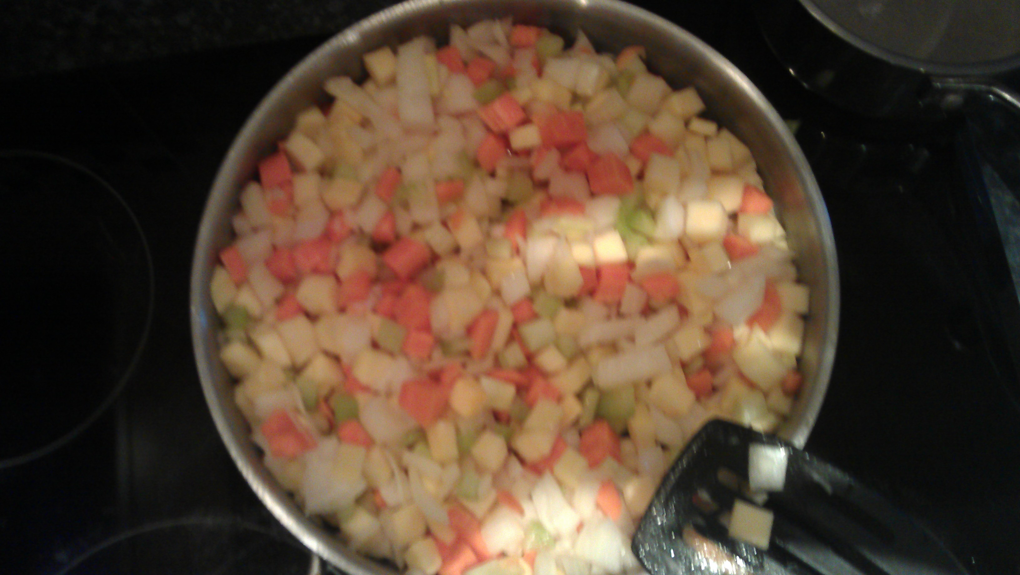 1. Heat a little oil in a frying pan over a medium heat, add the onions, carrots, celery and swede and gently saute until soft but not colored.