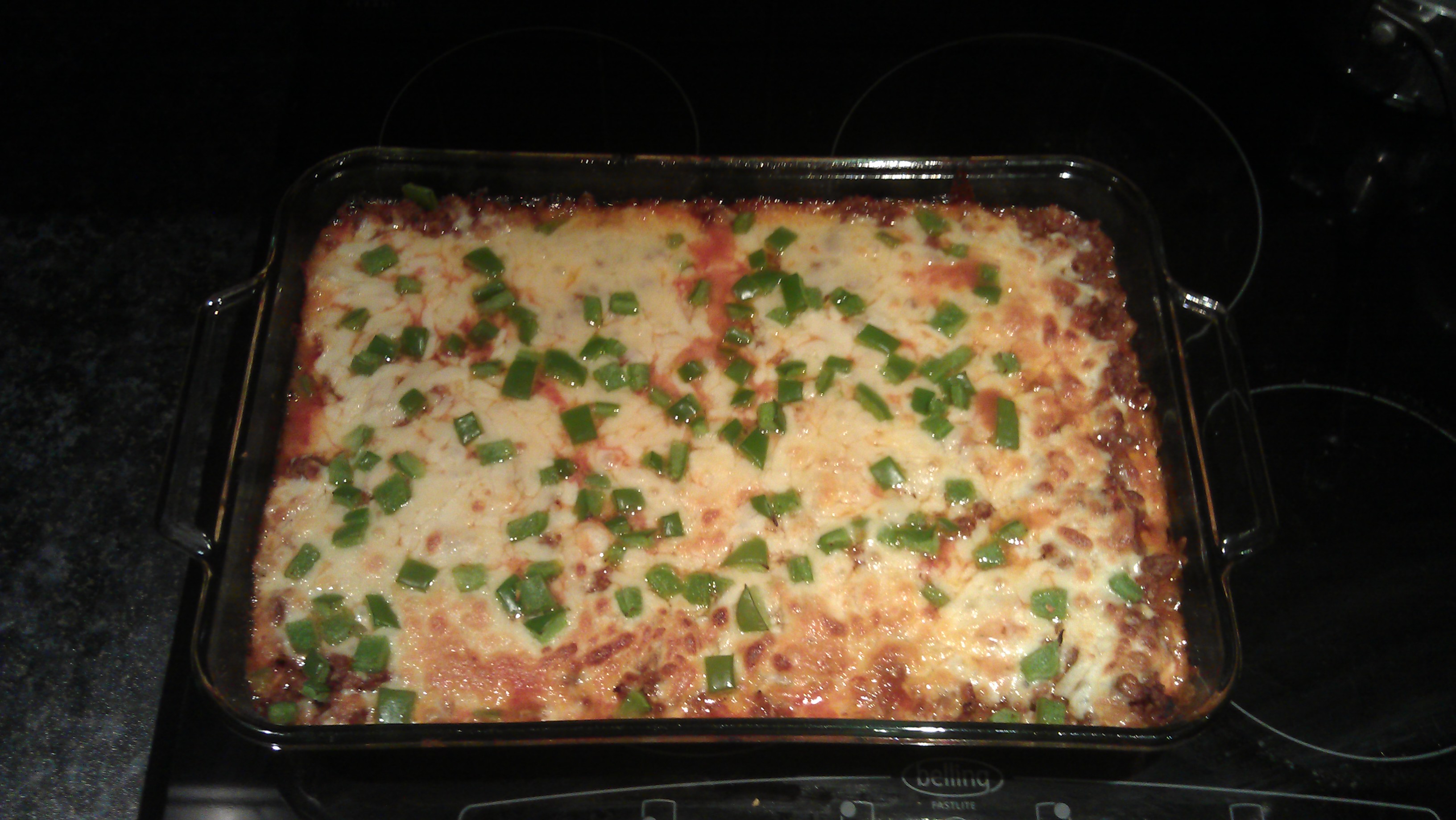 Mmm, this dish is very cheesy and yummy! It calls for shredded zucchini, but I didn’t have anything to shred it with at the time, so I used the vegetable peeler to make long strips. Andrew actually thinks he would prefer it this way, so I’ll probably use the peeler in the future when I make this again.
