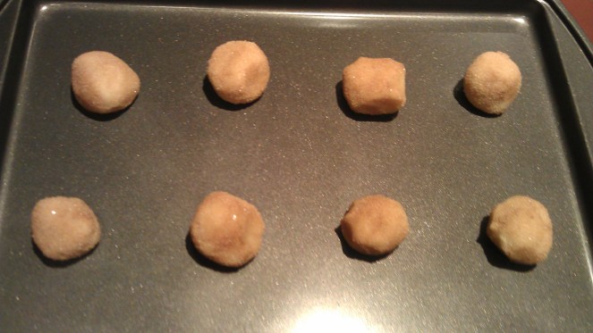 2. Shape dough into 1″ balls; roll in cinnamon-sugar mixture. Place 2″ apart on ungreased baking sheets.