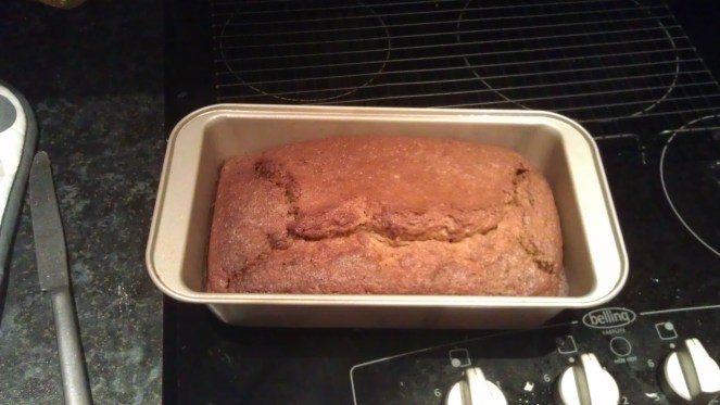 2. Pour into a greased loaf pan. Bake at 350F/180C for 65-70 minutes or until a toothpick comes out clean. Cool in pan for 10 minutes before removing to a wire rack.