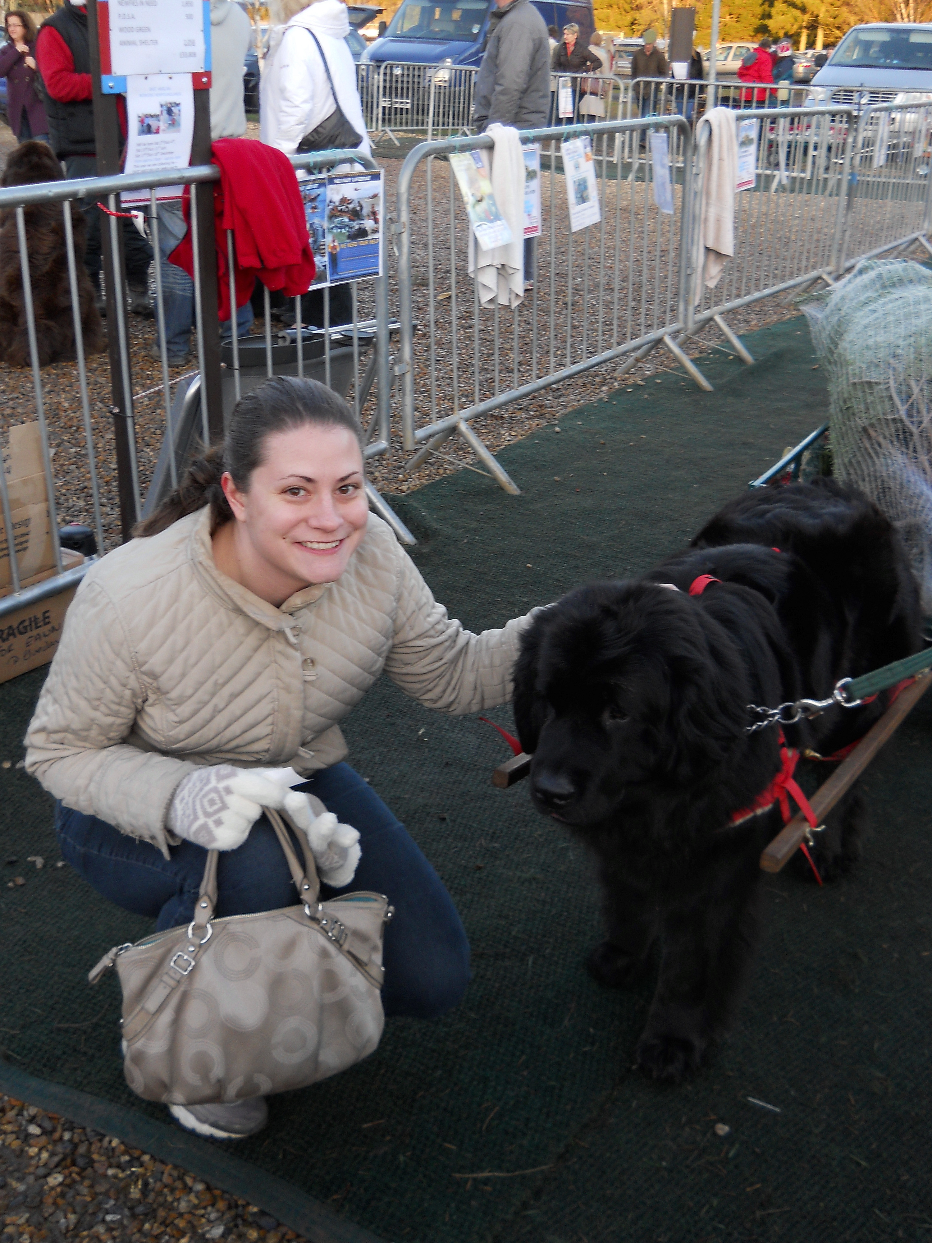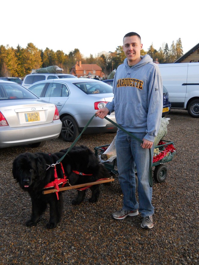 My favorite part of this tree farm? They had Newfoundland dogs there to pull your tree to your car in a wagon. It was free, although they were taking donations to raise money for either Dog Trust or just a Newfie rescue group, I think. We were happy to donate! Our dog was named Lucy. She was so pretty! Her handler (I assume he is also her owner) was so nice, and he insisted on taking pictures of us with her!