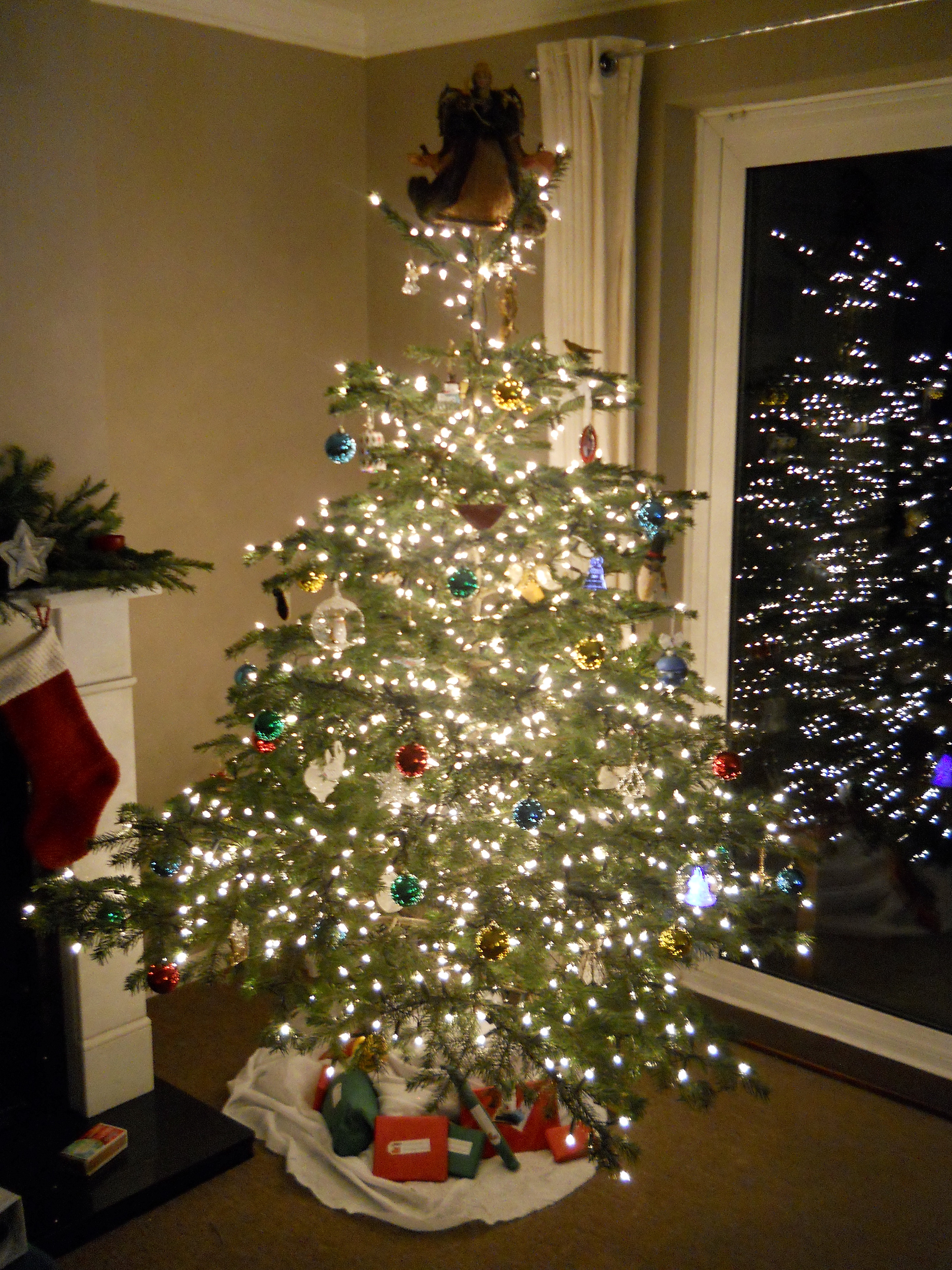 Next step was decorating the tree. The least expensive lights we could find for the tree (since we needed ones with UK plugs) were strands of 100 with no connecting plugs! So poor Andrew ended up string 1200 lights on our tree with numerous power strips. Our tree looked nice from the front, but there were 12 cords streaming out from the back, haha! All we could really do was laugh at that point.