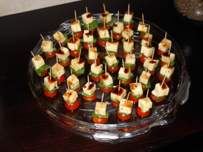 These are called Caprese Skewers, and I found the recipe on Pinterest. Appetizers are often kind of tedious to make, but these came together fairly quickly! I thought they were absolutely delicious, and we only had a few left over. Plus they’re in Christmas colors — what more could you want? đ