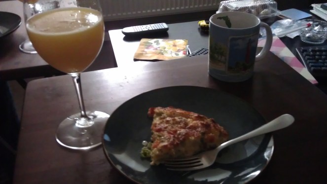 My mom always made some sort of Christmas breakfast for us. Obviously, my mom wasn’t around to do that this year, so I had picked out a yummy frittata to try. I had already torn up bread for the soft bread crumbs, and I had chopped the vegetables the night before, so this was pretty quick and easy to throw together. We opened presents while it was baking.