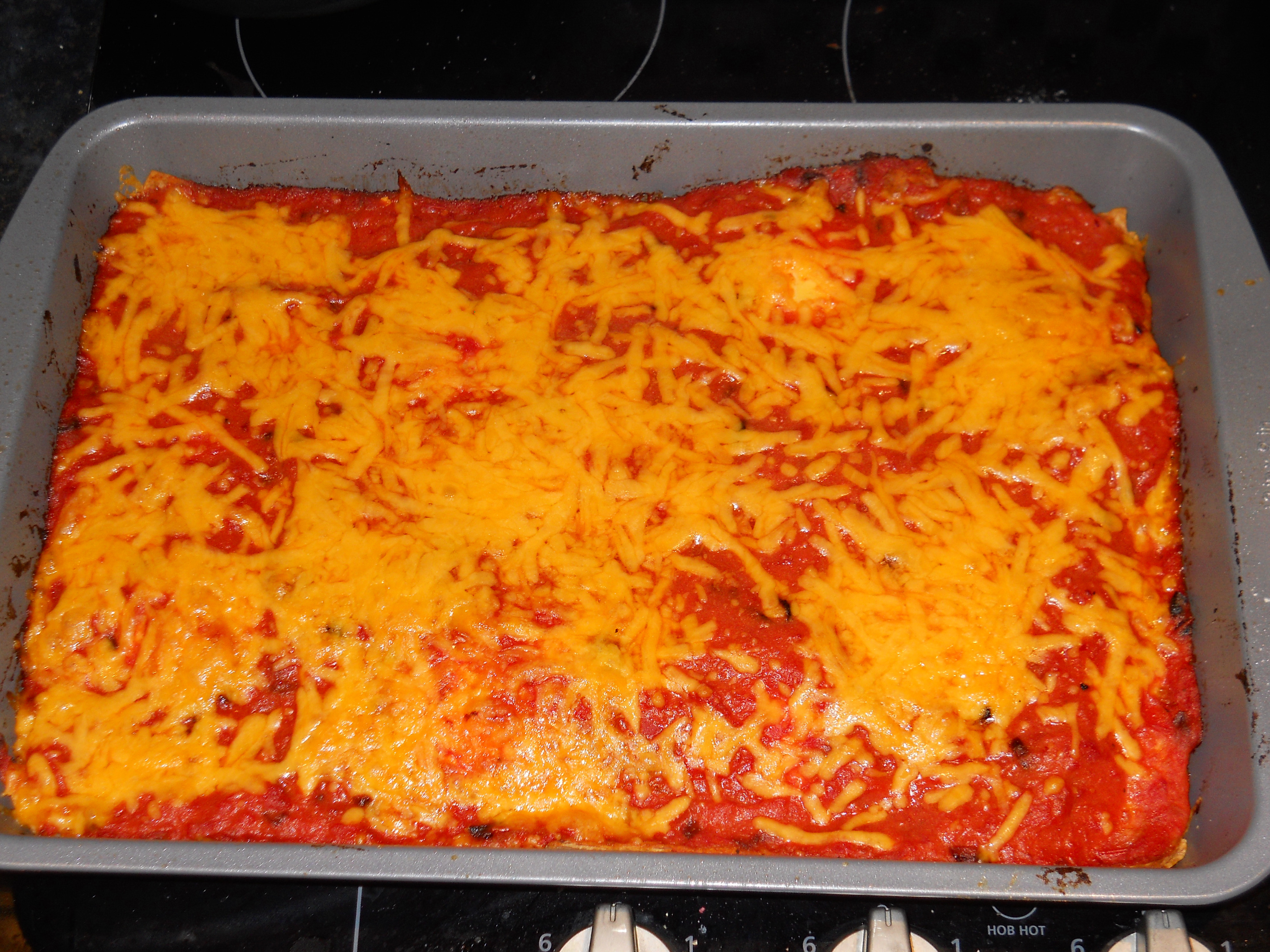 Just a quick note: if your casserole comes out not looking like mine, that’s okay. I mixed up the layers on mine! I forgot to put that remaining layer of sauce on before the eggs, so I cooked the casserole until the eggs were nearly set, then put on the remaining sauce and sprinkled it with the cheese. Still tasted great. 🙂