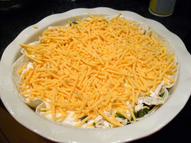 1. Adjust oven rack to middle position and hat oven to 450F/220C. Grease a 9″ pie plate. Press tortilla into prepared pie plate and spray lightly with cooking spray. Toss chicken, cilantro, jalapenos, 1 cup of cheese, 1/2 teaspoon of salt, and 1/2 teaspoon of pepper in a large bowl until combined.