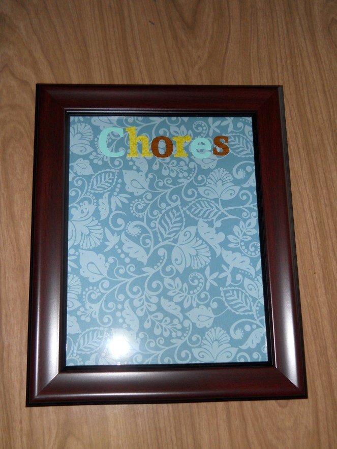 First make your background for the frame. I took a 12″x12″ piece of scrapbook paper and cut it down to fit in the frame. Then I used letter stickers to spell out “Chores.” When I made one of these for my mom, I just printed out the title letters, cut them out, and glued them on.
