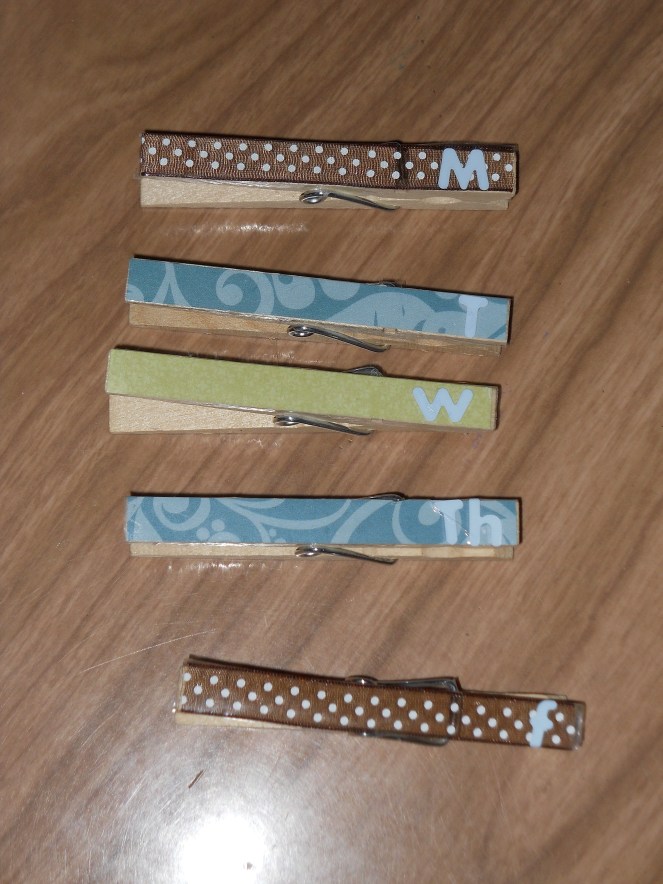 Next decorate your clothespins. I measured the clothespins, then cut pieces of paper to fit. I attached the paper with double-sided tape. Next I added letter stickers for the days of the week. Finally I covered the decorated part of the clothespin with packaging tape. You could also use Mod Podge to do this.
