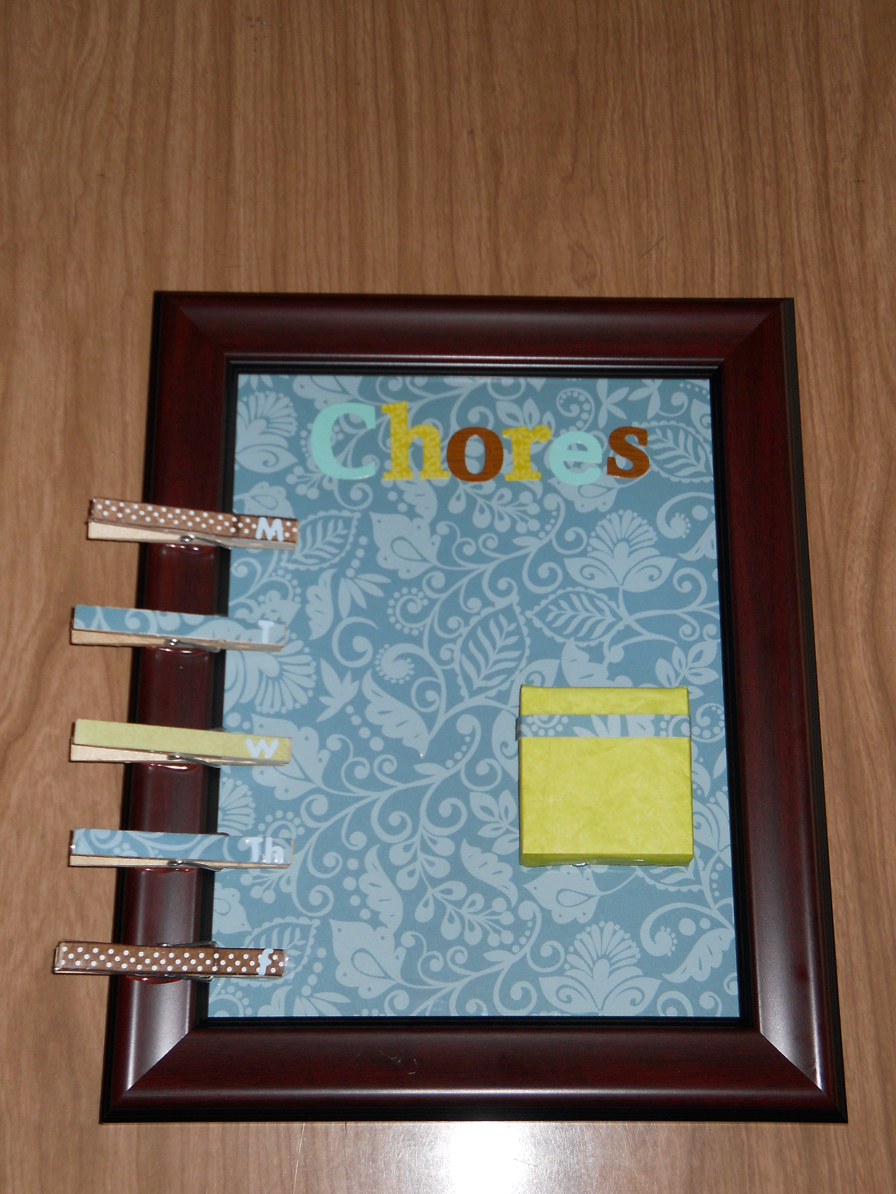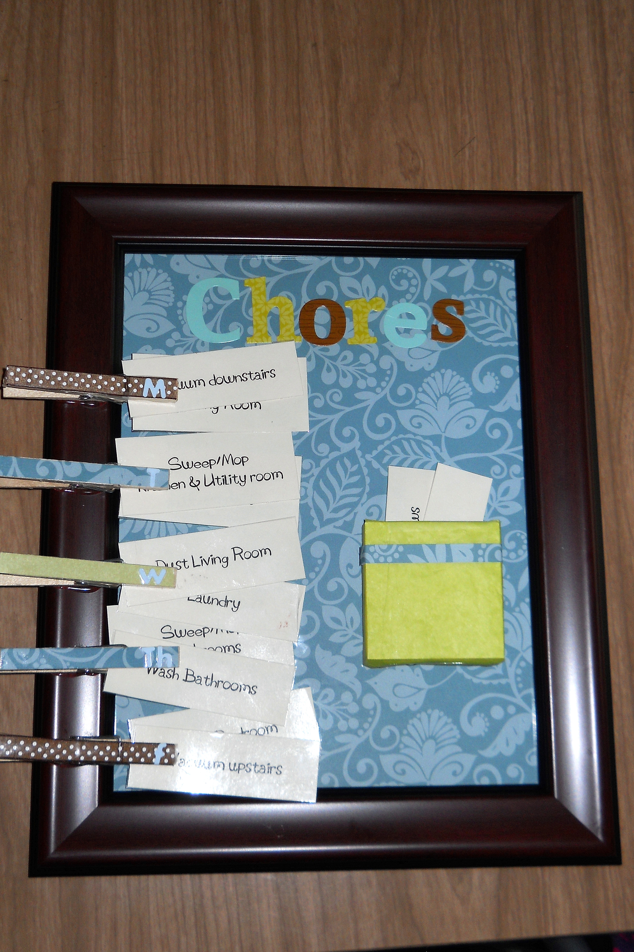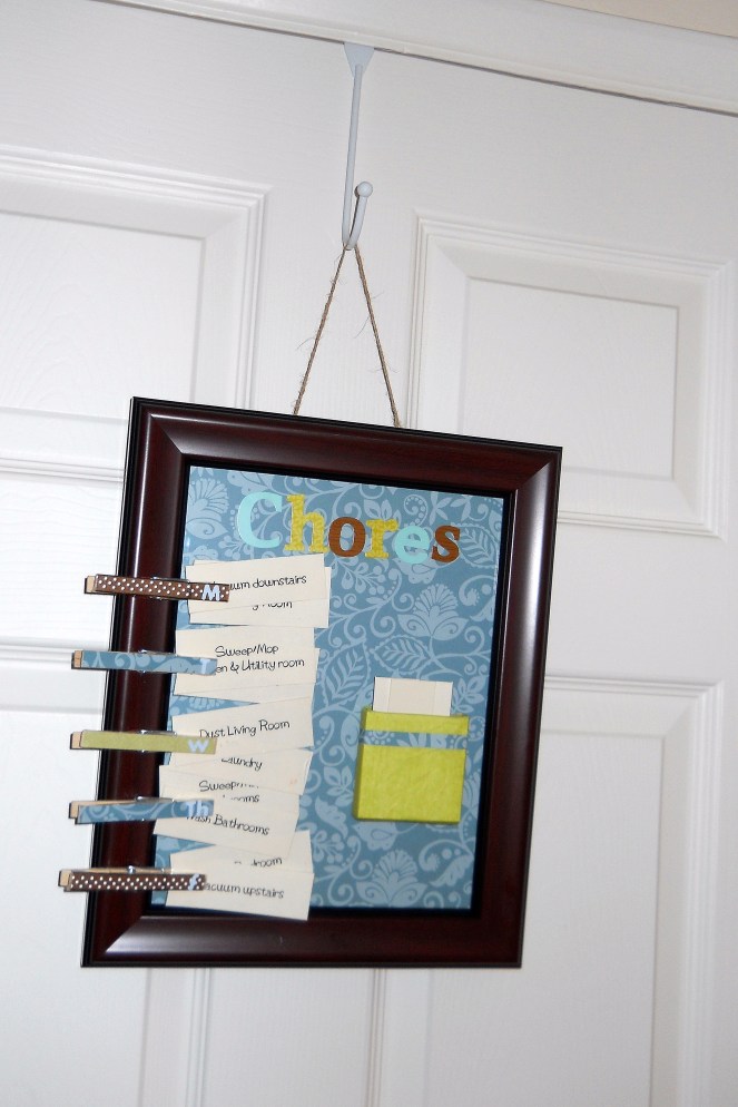 And that’s it! Put your chores in the clothespins however you wish, and hang your board up somewhere where you will see it. I hung mine on a door, but a wall in the kitchen would be convenient too.