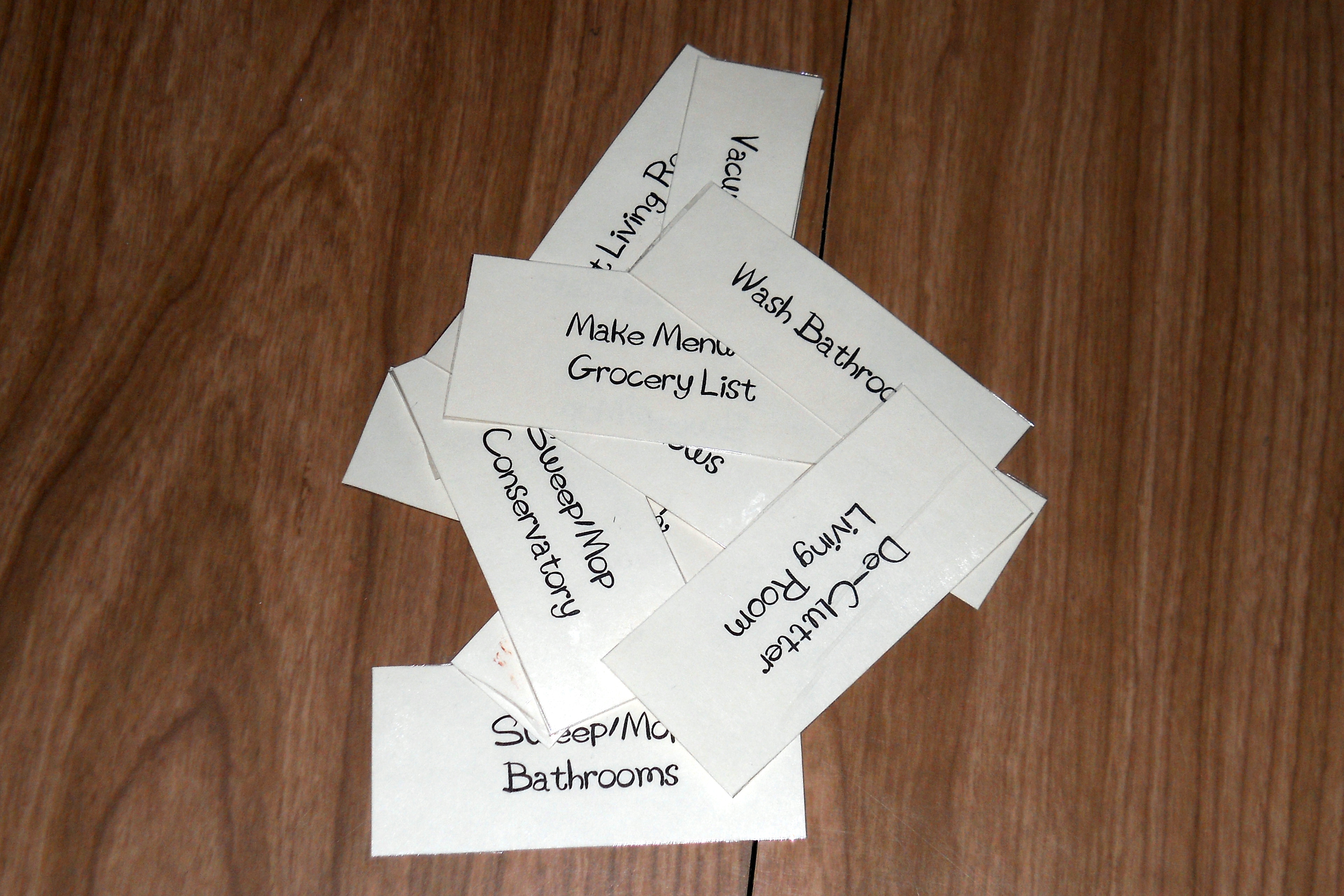 Have you already come up with your list of chores? If not, now is the time to do it. I typed mine out in a cute font and printed them out on cardstock. Then I cut them out and covered them in packaging tape (it’s my cheap way to laminate things!).