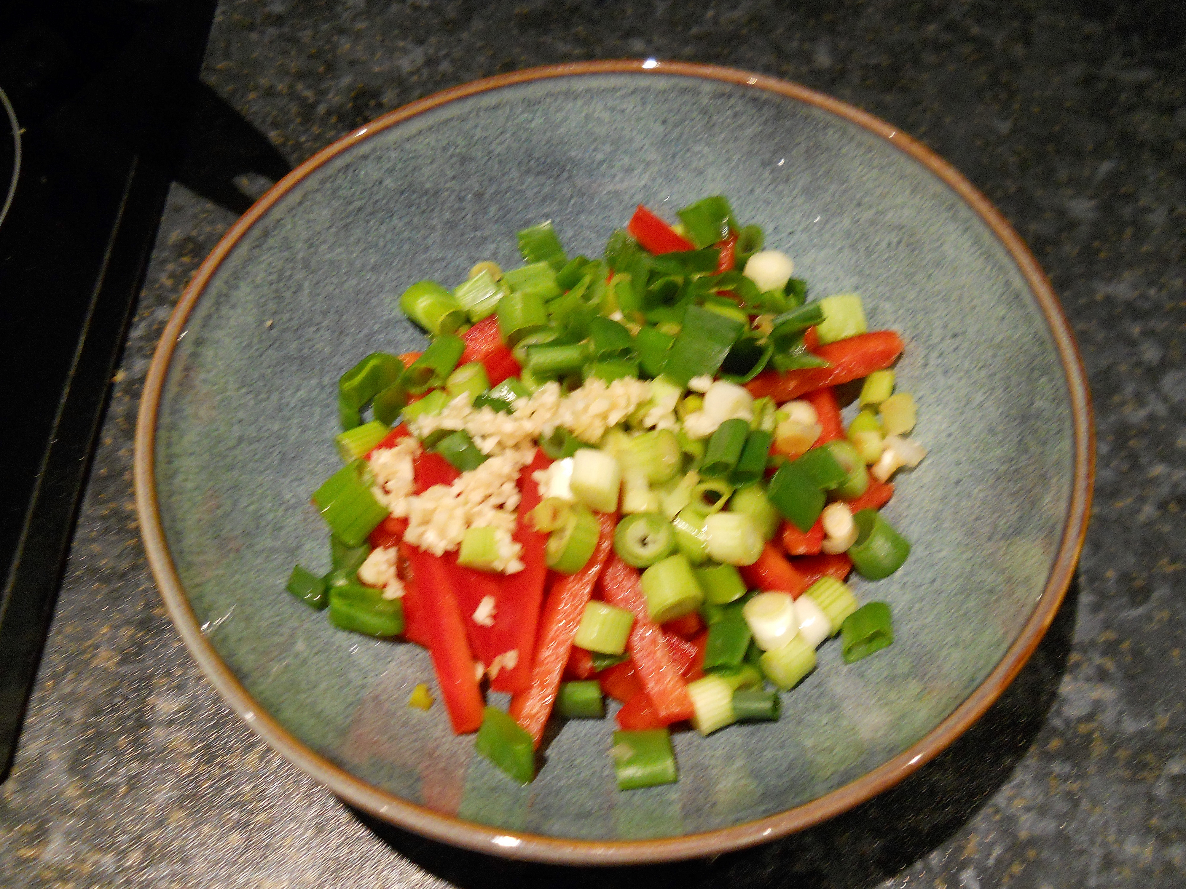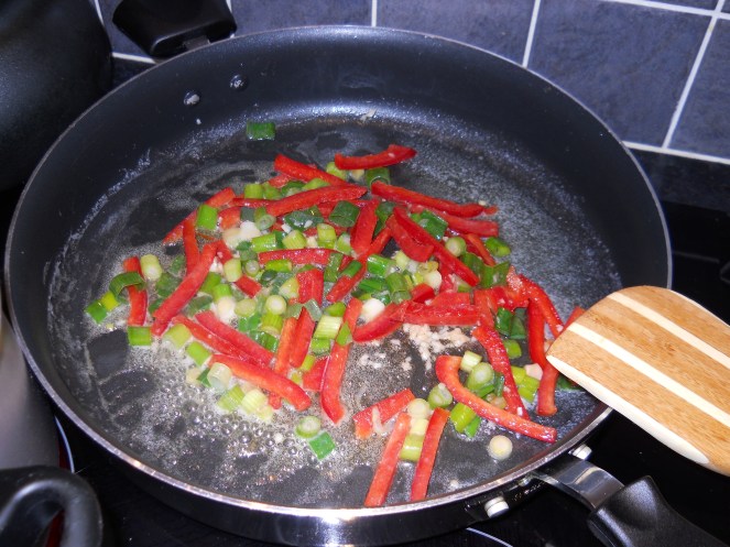 1. In a large skillet, saute red peppers, mushrooms, onions, and garlic in butter.