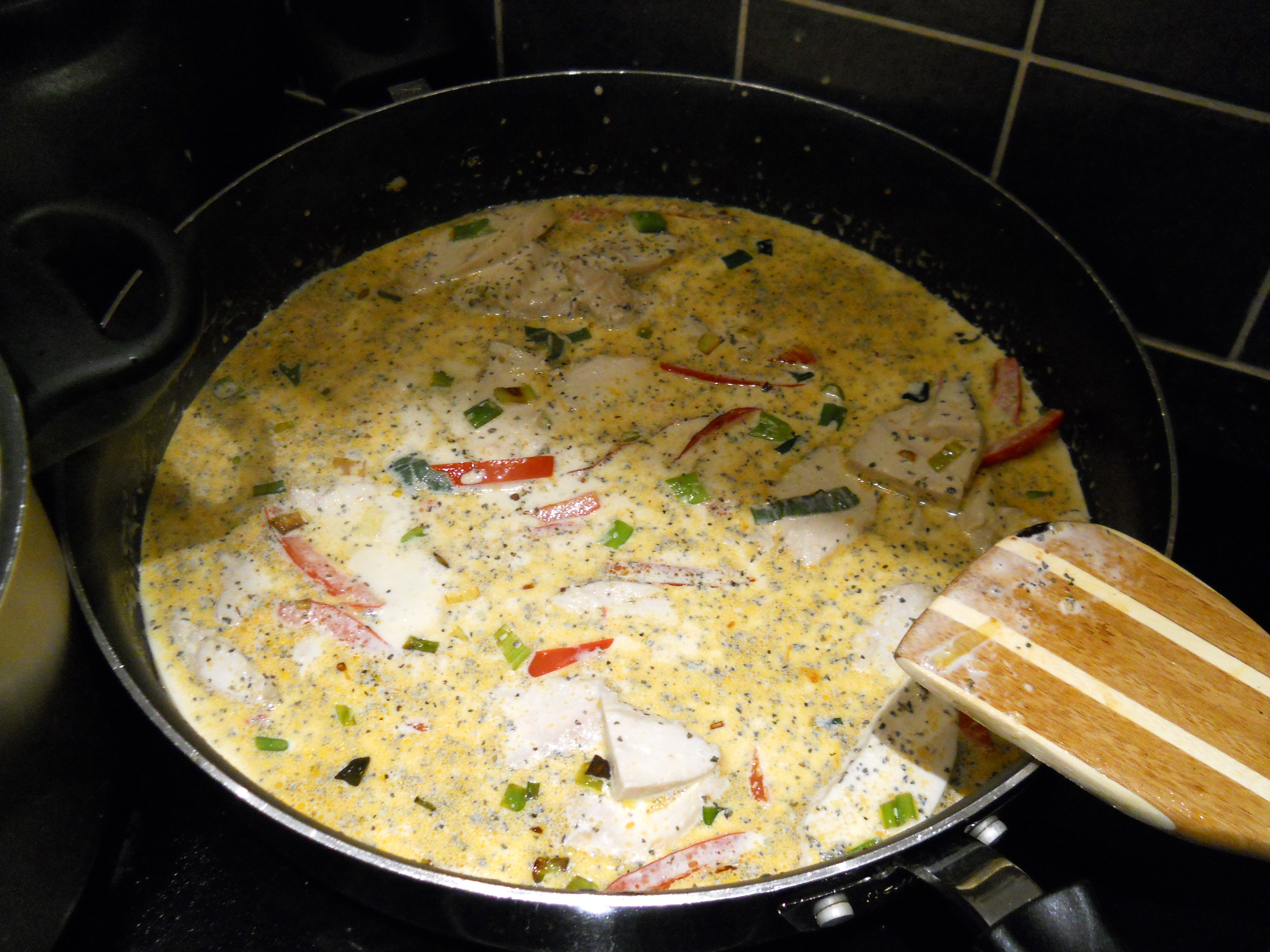 2. Add the cream, basil, chicken, and salt. Cook and stir until slightly thickened. Serve over pasta.