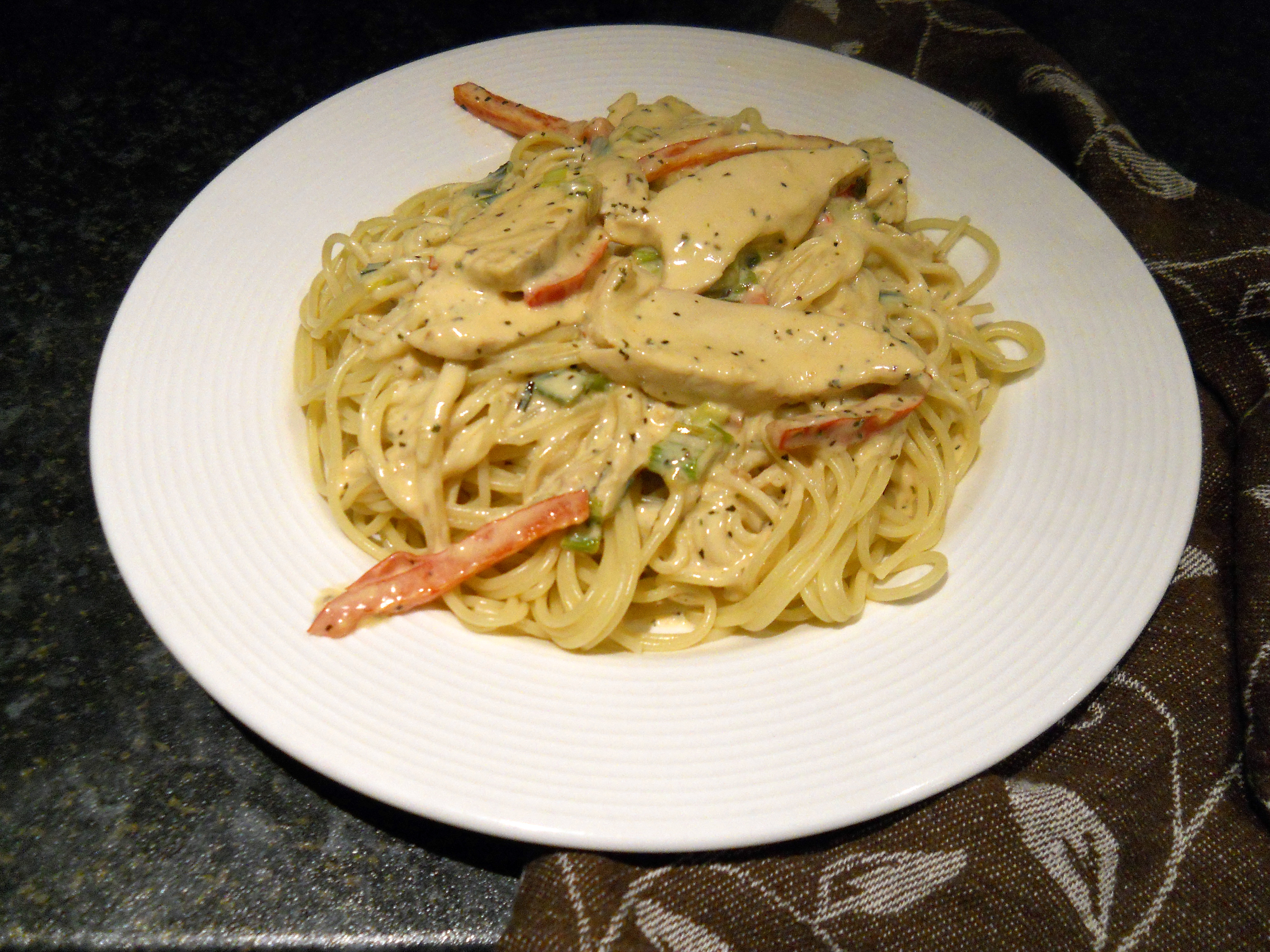 2 grilled boneless, skinless chicken breast halves, thinly sliced (I pan-fried mine)