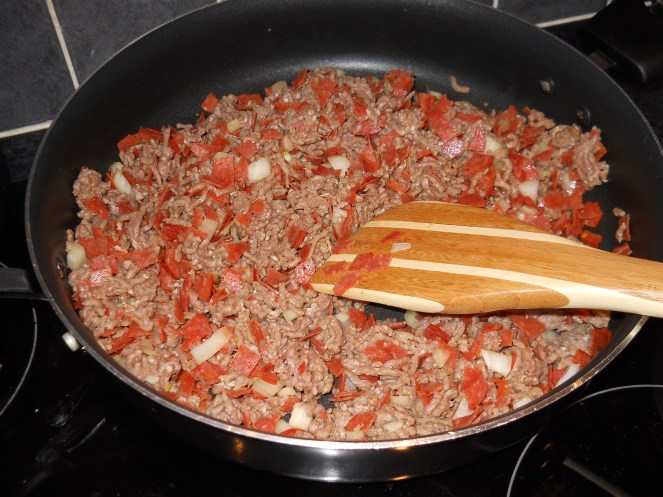 1. Adjust oven rack to upper-middle position and heat oven to 375F/190C. Heat onion, pepperoni, and beef in a large saucepan over medium heat, breaking up mixture with wooden spoon, until no longer pink, about 5 minutes.