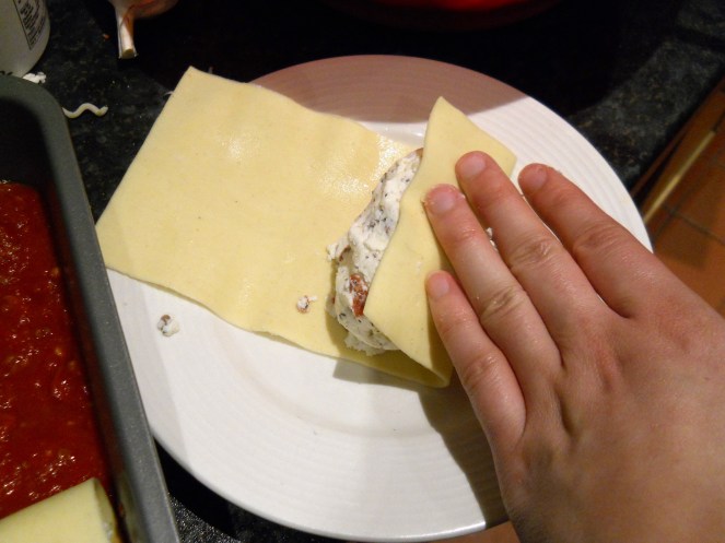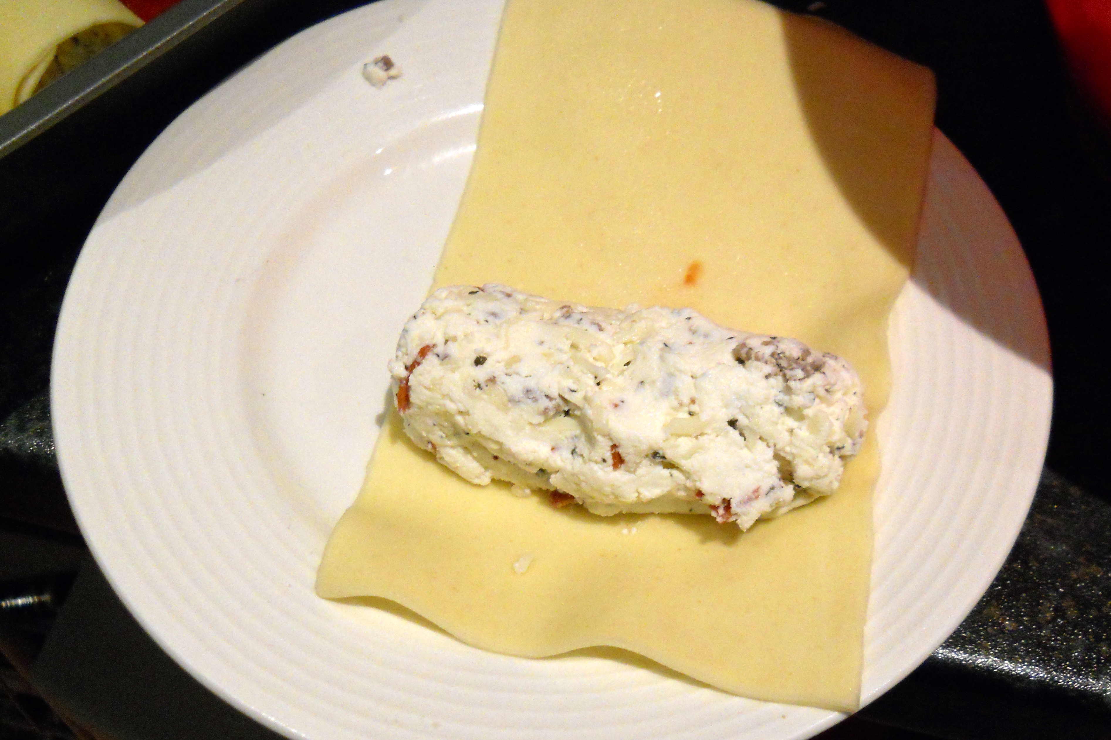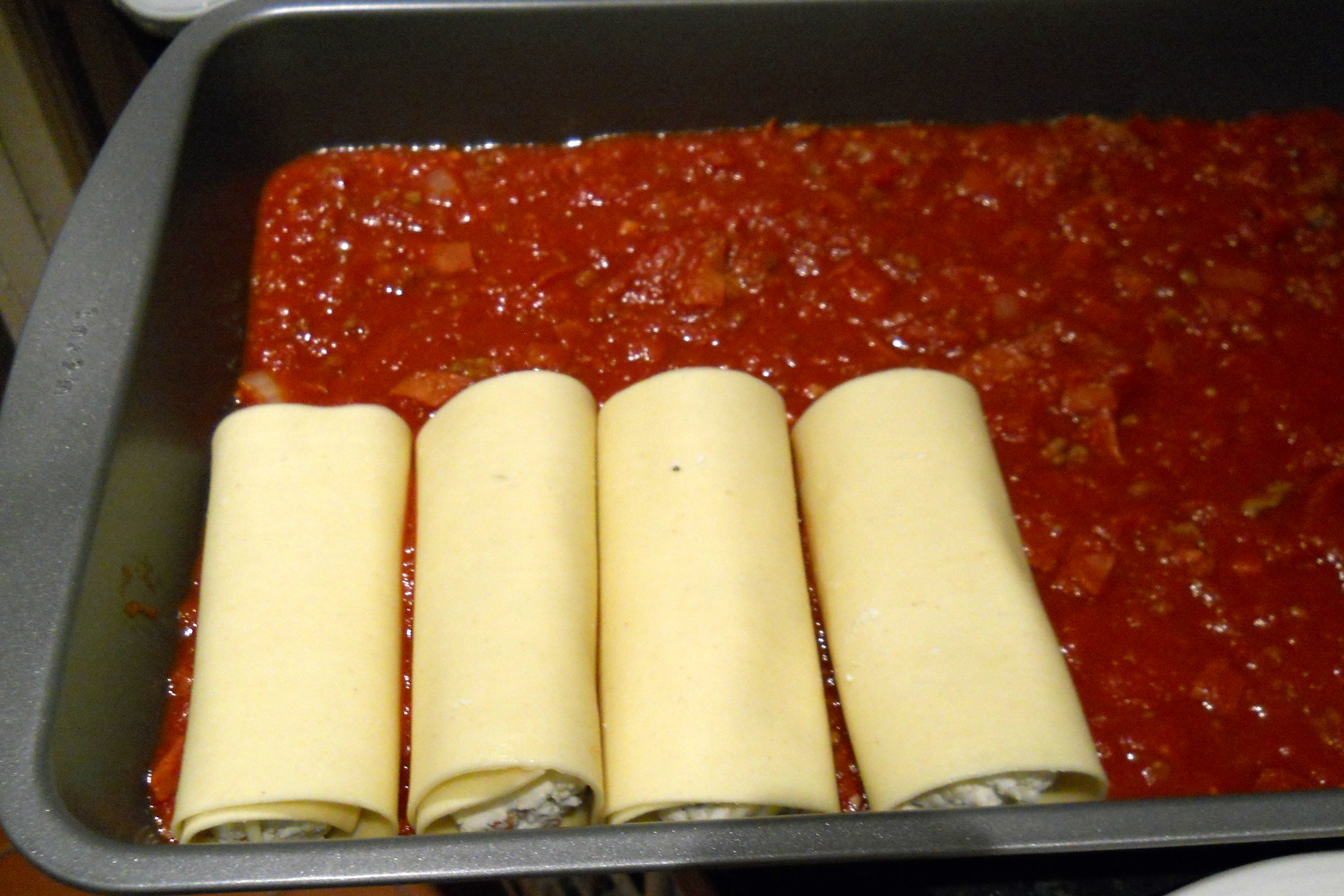 5. Spread half of meat sauce over bottom of baking dish. Following photos below, top each soaked noodle with 1/4 cup cheese filling, roll, and arrange, seam-side down, over sauce in baking dish.