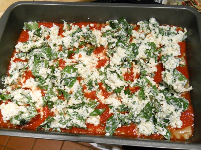 4. Spread 1/2 cup tomato sauce on the bottom of a 9×13″ baking dish. Top with 3 noodles and a quarter of the remaining sauce (a heaping 1/2 cup), and dollop with a third of the ricotta mixture (about 2 cups); repeat twice. Top with the remaining 3 noodles and sauce.