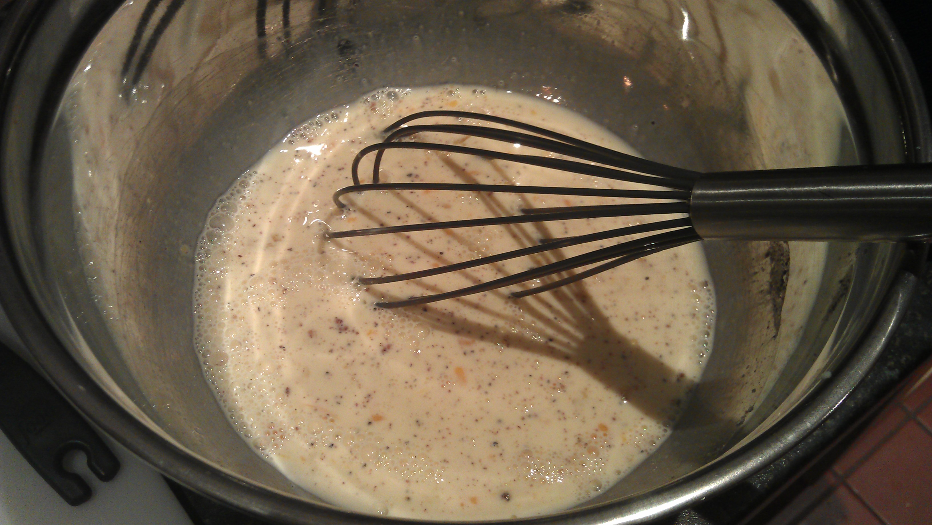 1. Heat oven to 350F/180C. Oil a 2-1/2 to 3-quart baking dish (I just used a 9×13″ pan). In a large bowl, whisk together the eggs, milk, mustard, nutmeg, and 1/4 tsp each salt and pepper.