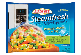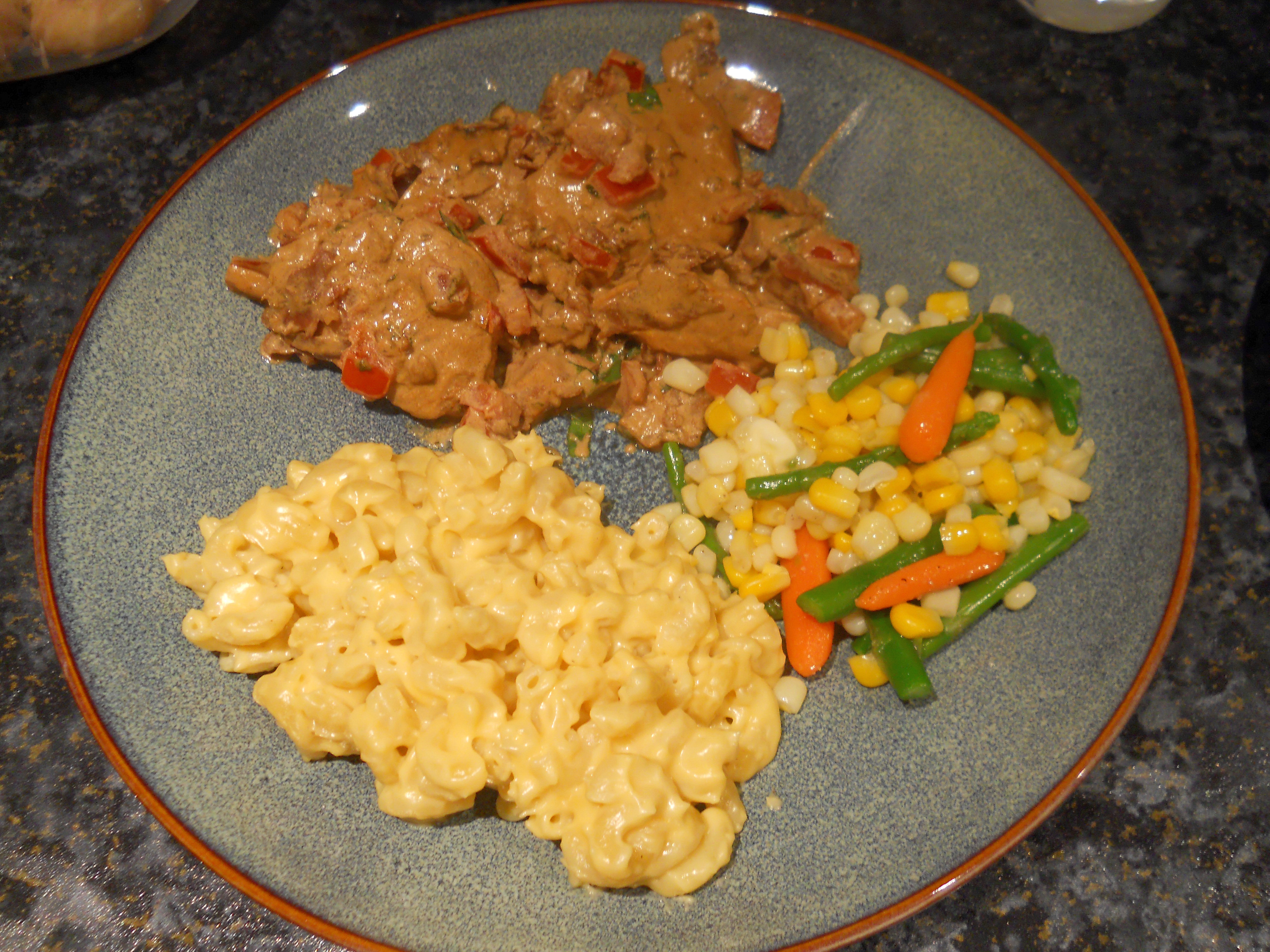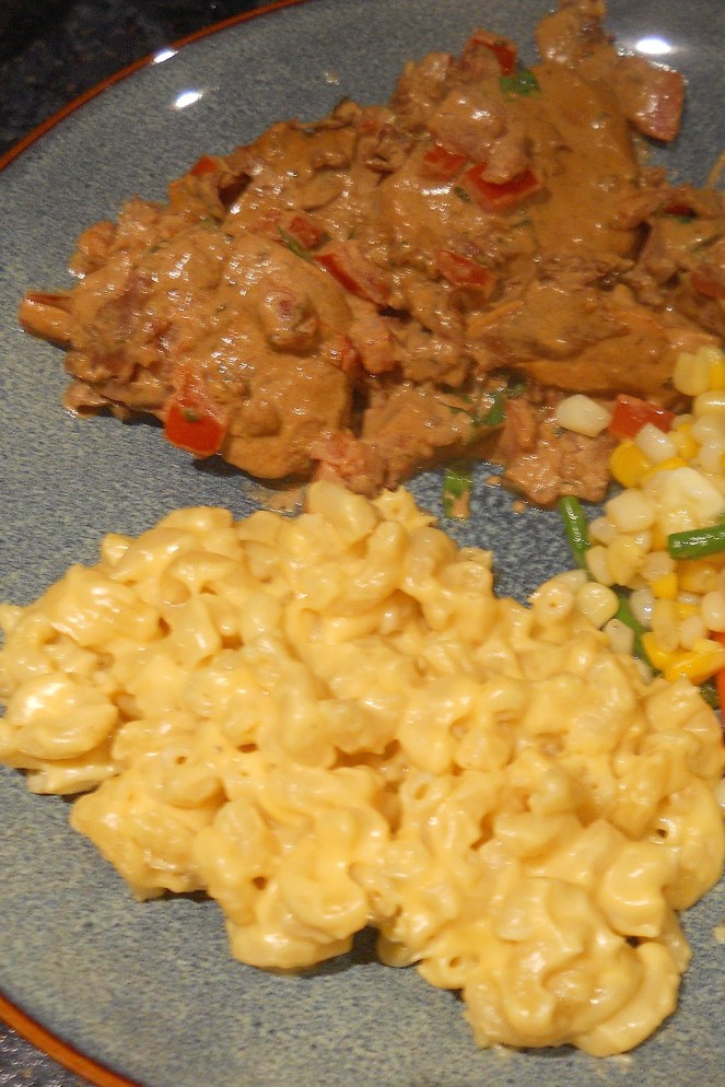 I paired it with a recipe for a very quick, easy, and inexpensive macaroni and cheese. When I realized we were lacking vegetables, I threw a bag of frozen mixed veggies in the microwave while I assembled the plates. Andrew says these were some of the best from-the-freezer veggies he’s ever had: