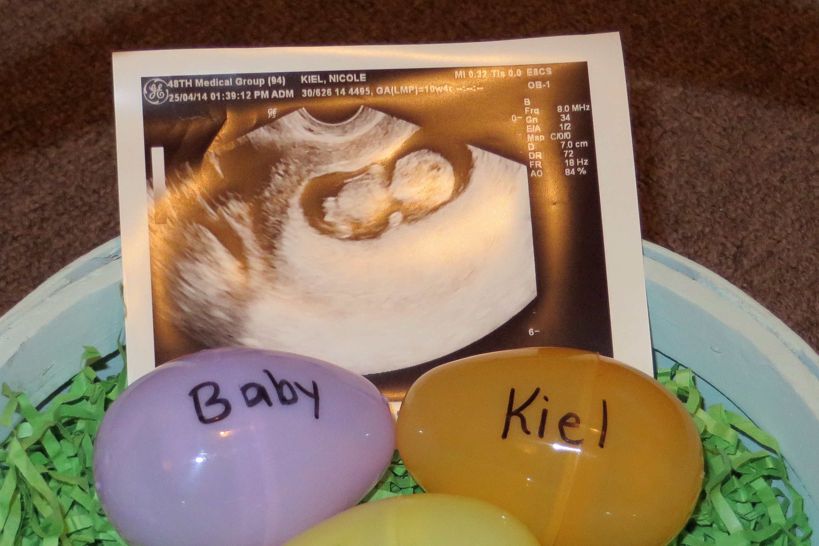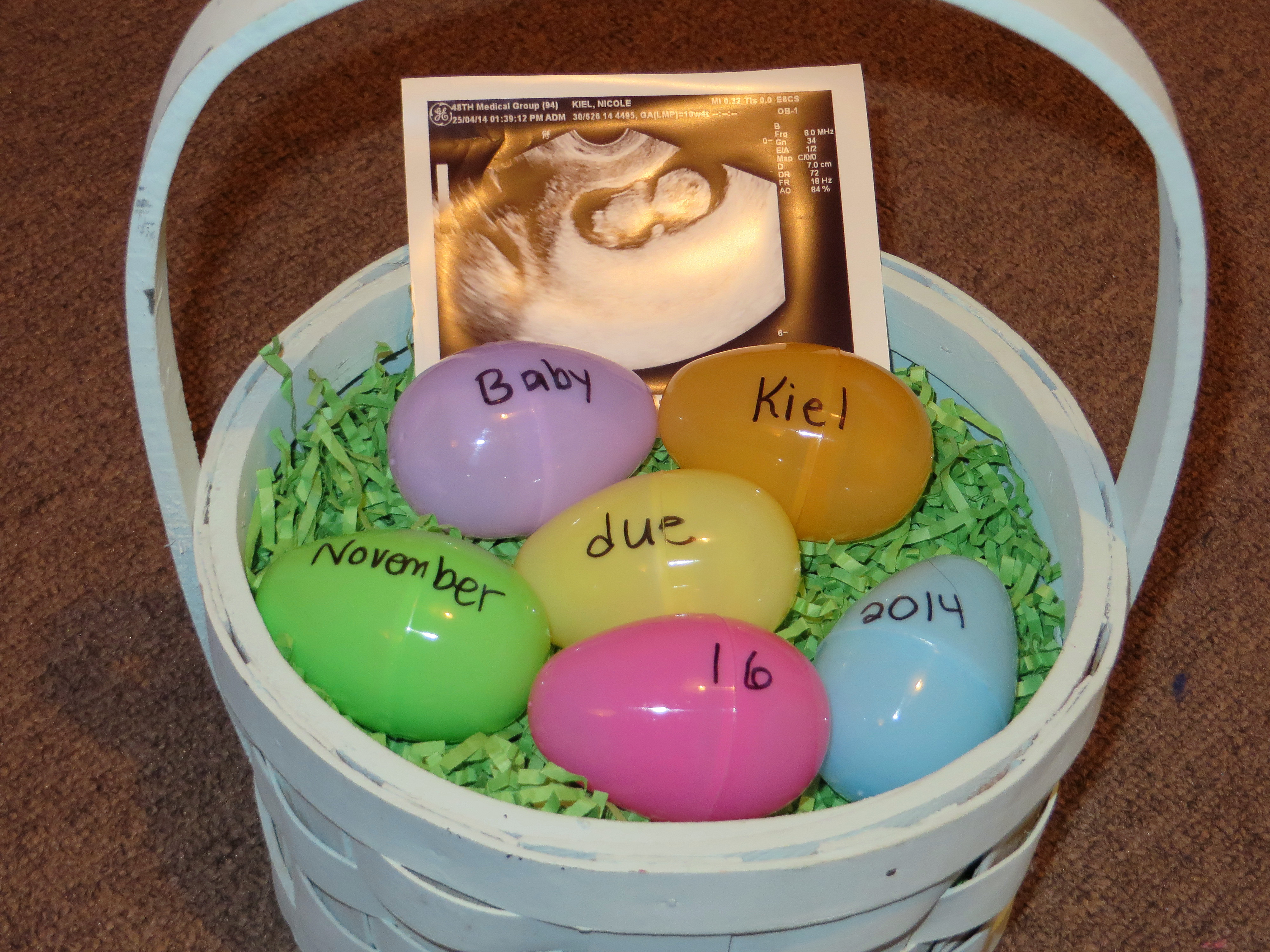 Look at our sweet baby! He or she was facing us for the ultrasound, so we had to try to move him/her to get a profile shot to properly measure the length. The doctor told me to just try to massage my lower belly, and it actually worked. I’m not sure why I was surprised… I just didn’t think the baby moved much at this point! I could have just watched our baby on the screen forever, it was such a wonderful experience.My other big plan for the day (after our appointment) was to send some belated Easter messages to our extended family and close friends: