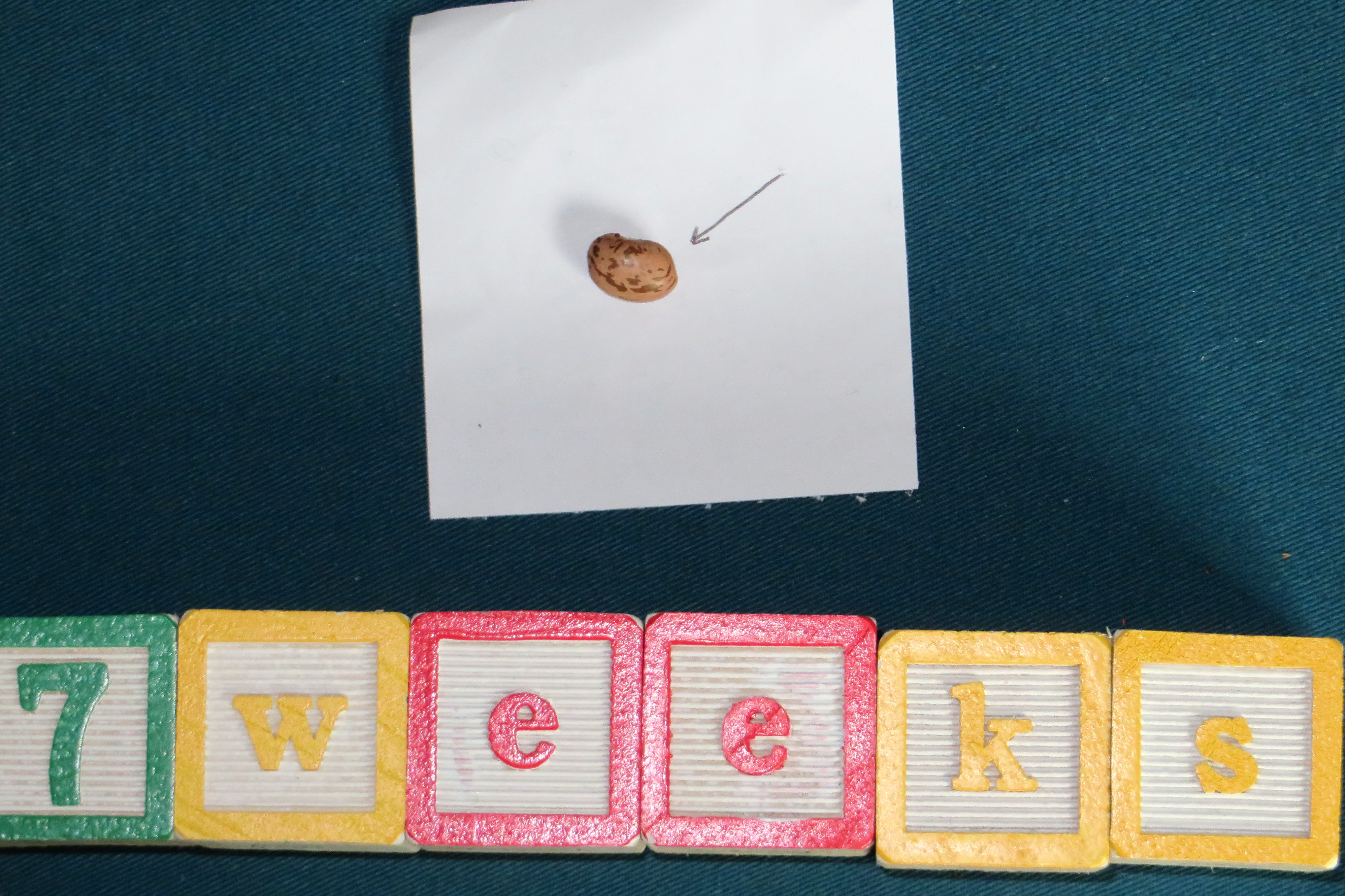 First of all, Baby is about half an inch long now. Or the size of a blueberry. Which I didn’t have on hand. So instead I found a bean that was about half an inch long. π