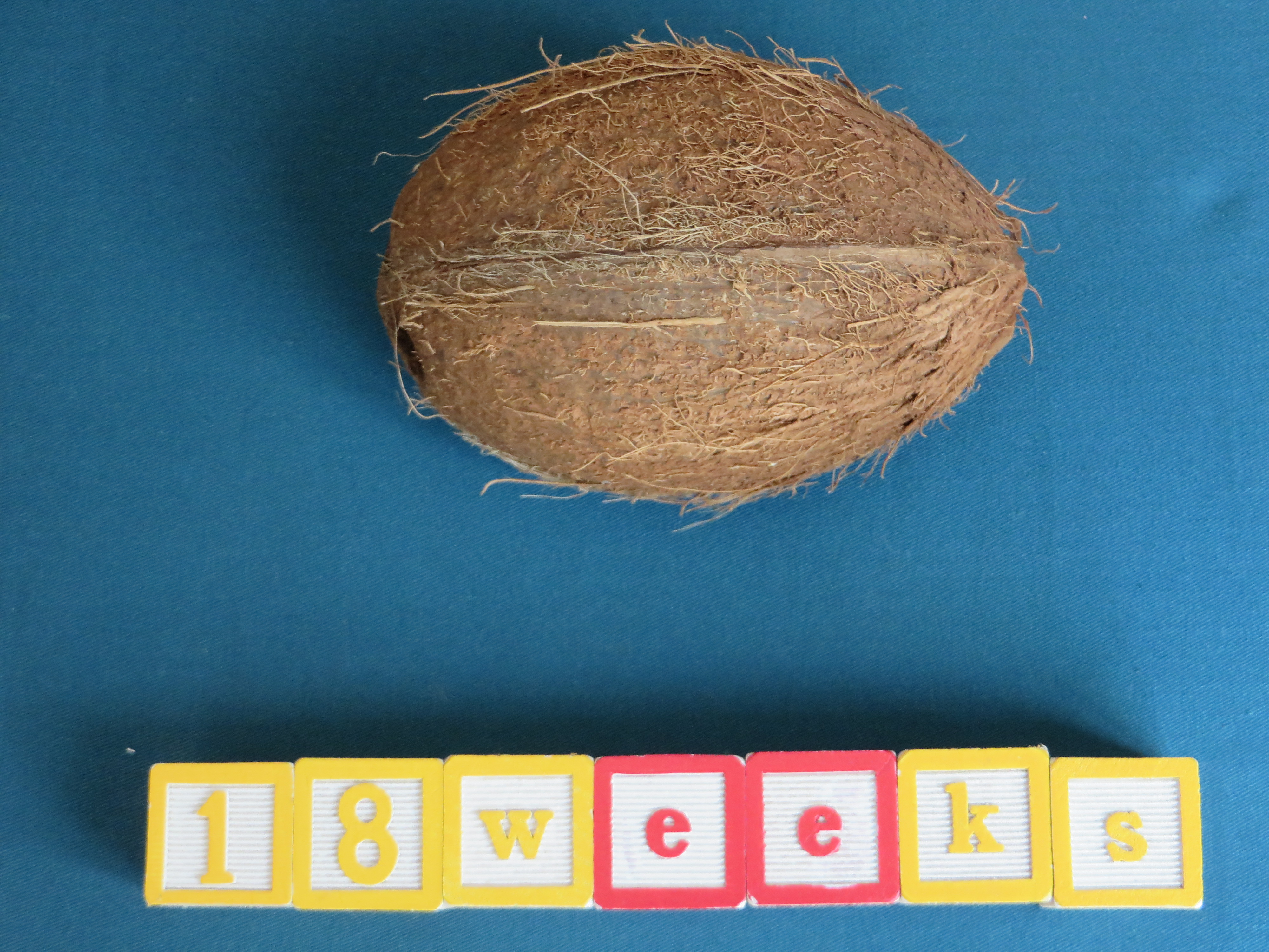 18 weeks and Baby is the size of a coconut! He/she is about 5-1/2″ long now and weighs about 5.3 ounces. He or she can yawn now too!