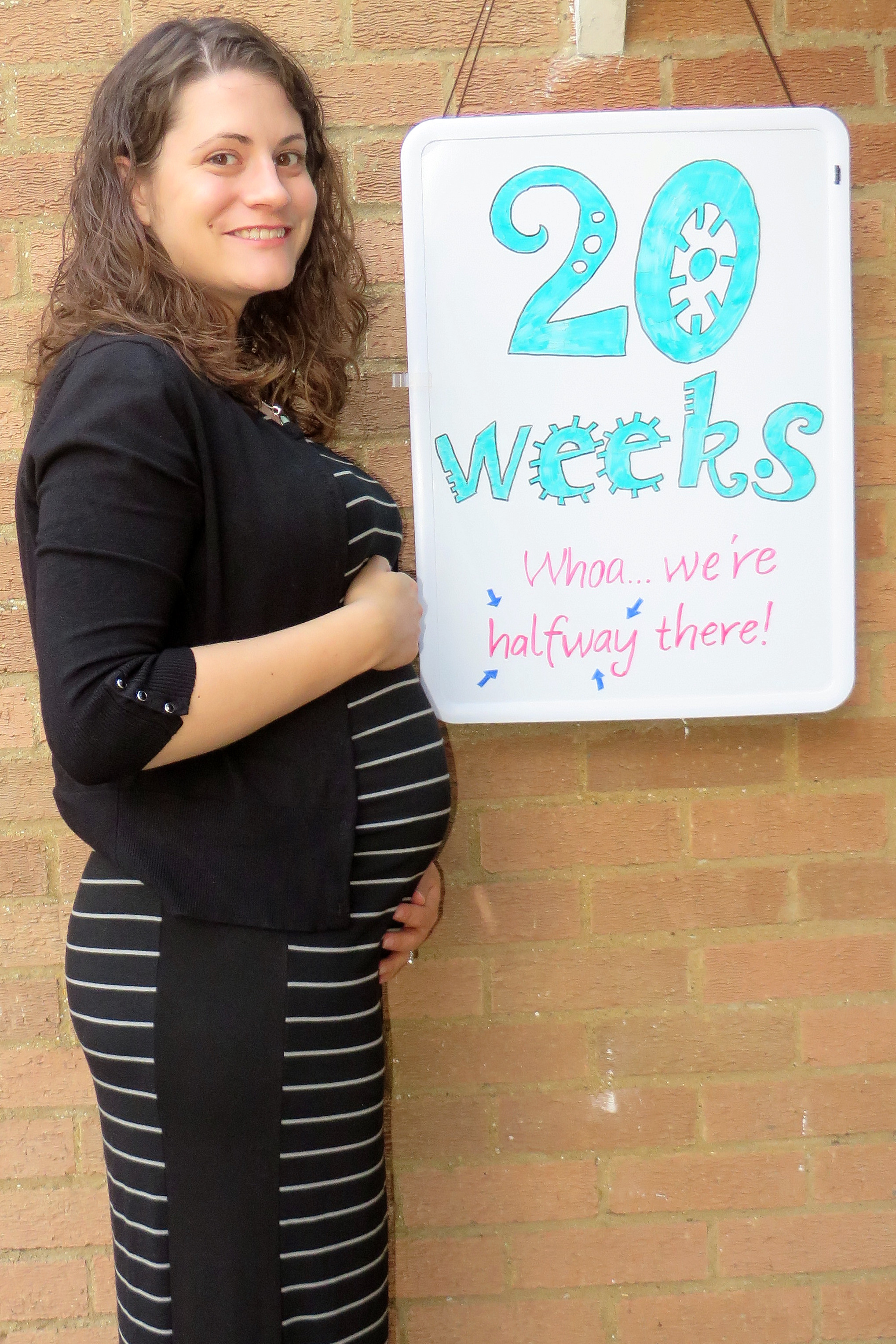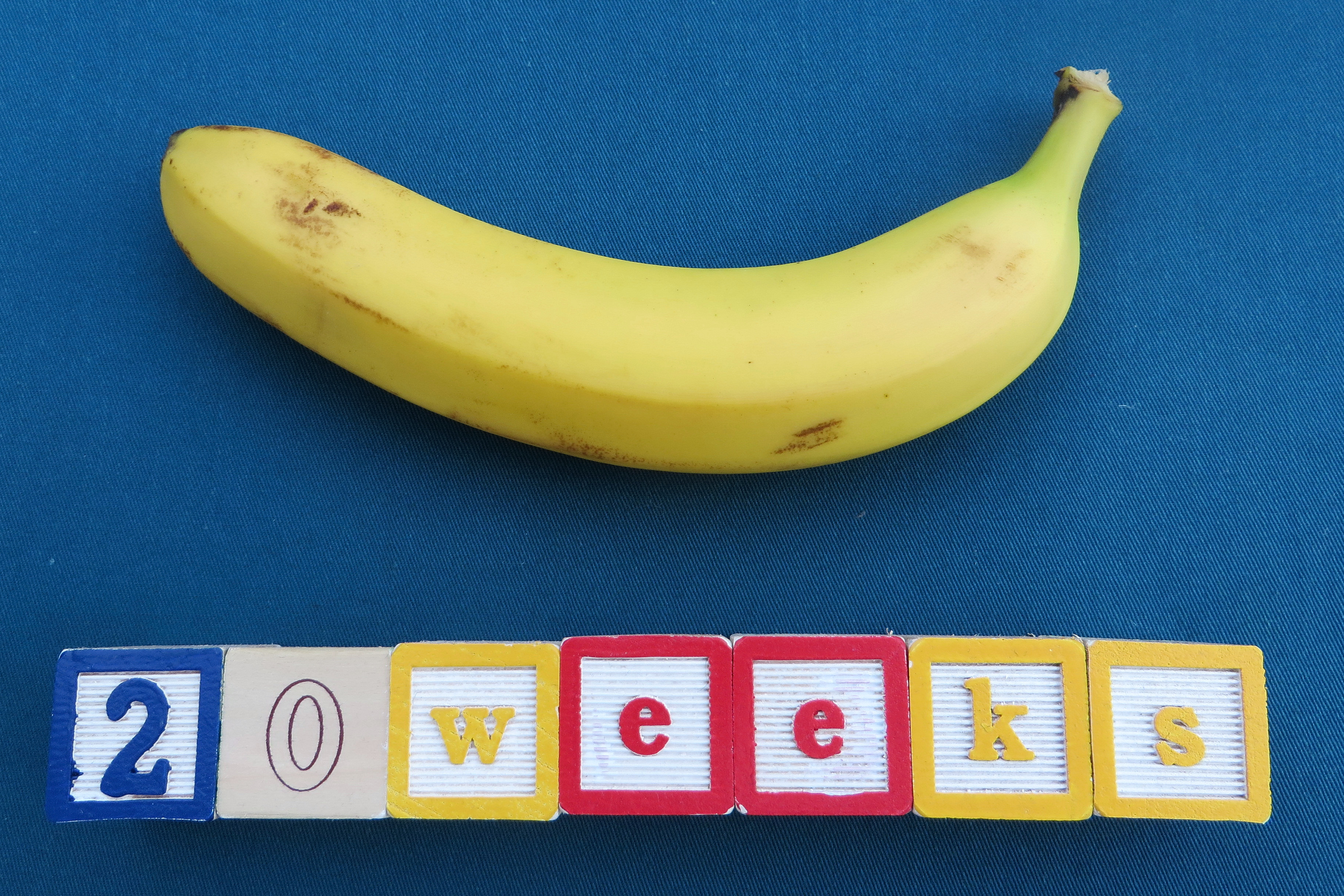 20 weeks, and we’re halfway done with this pregnancy! Baby is as long as a banana, or about 10″ from crown to heel. All the previous lengths were crown to rump since the baby curls his/her legs up, but from now on it will be crown to heel. Baby also weighs over 10 ounces now.