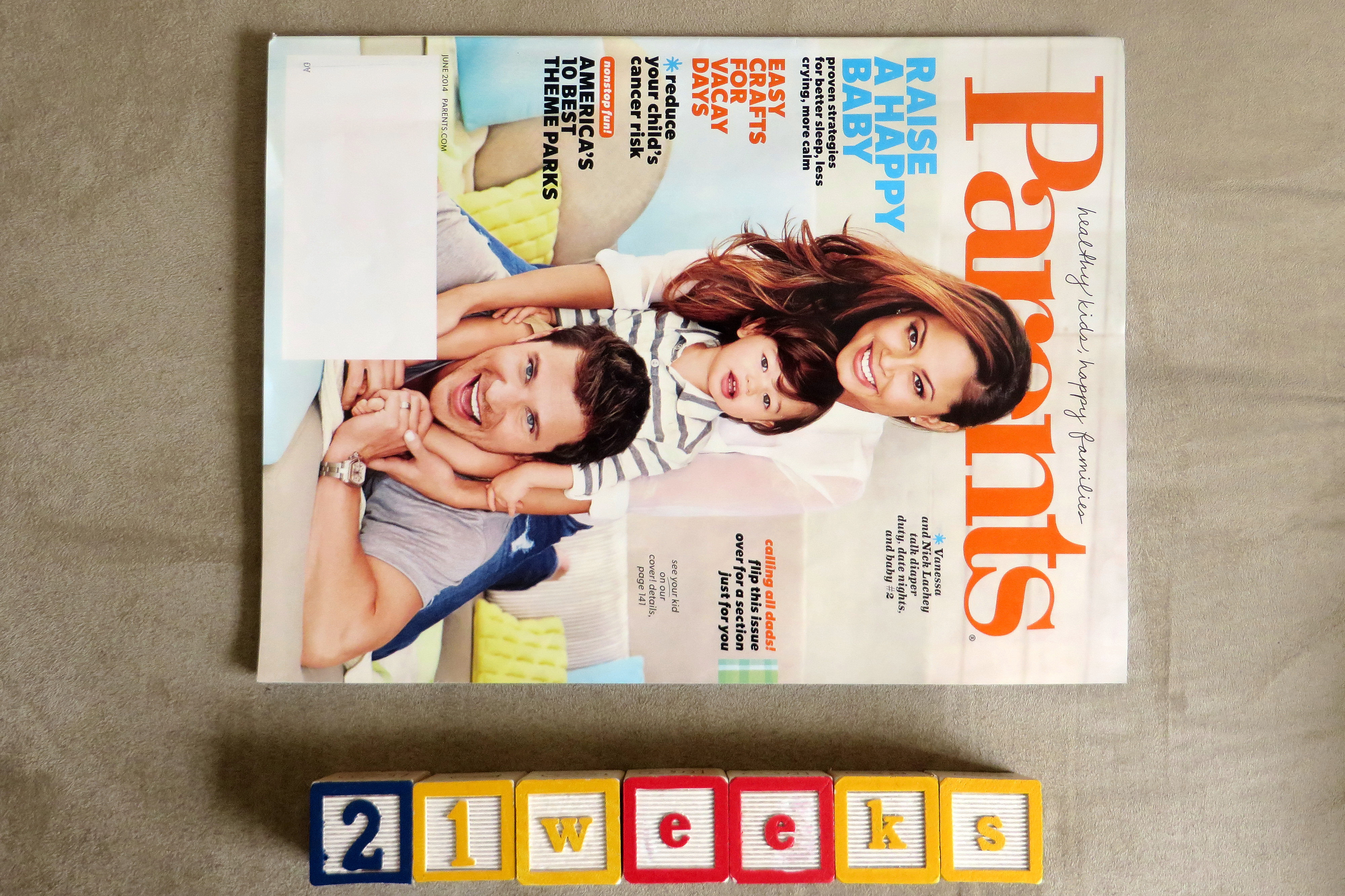 Yes, I’ve given up on the usual fruits and veggies as measurement aids. This week was supposed to be a carrot, but none of the carrots I saw were anywhere near 10.5″ long! I searched around the house for something else that was the right length, and the magazine I was reading was perfect! So Baby is the length of a standard magazine from head to heel. He/she actually only weighs about 12 ounces. And from head to rump, Baby is about 7″ long (probably closer to the length of a carrot actually).