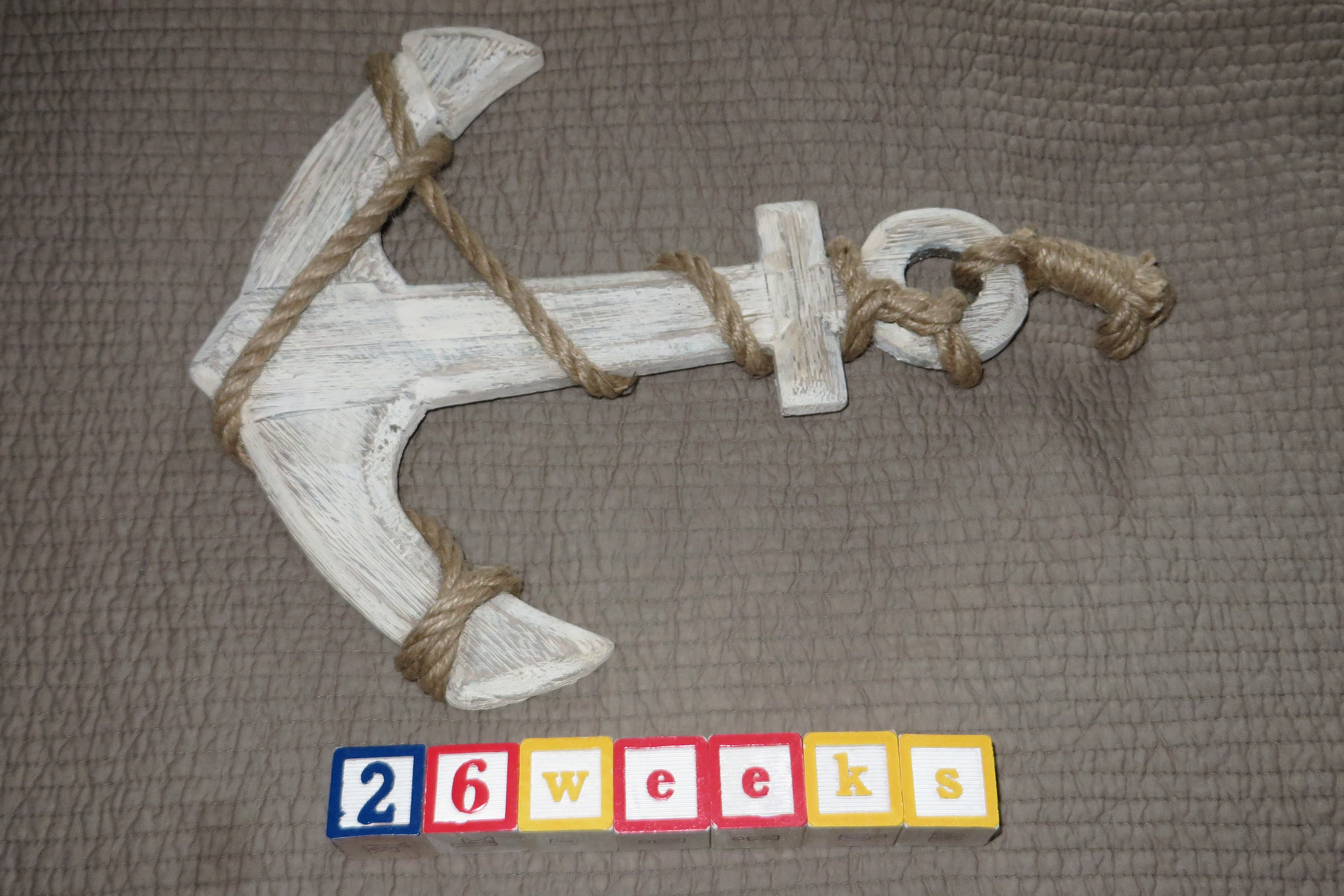 Baby Kiel is now about the length of this anchor, which will be part of the nursery decor! I don’t think I’ve posted anything about plans to decorate the baby’s room (once we move to our next base), but after collecting some cute items during our trip to Cornwall in April, I settled on a nautical nursery theme for Baby Kiel. Anyway… our little one is about 14″ long from head to heel and weighs about 2 lbs now!