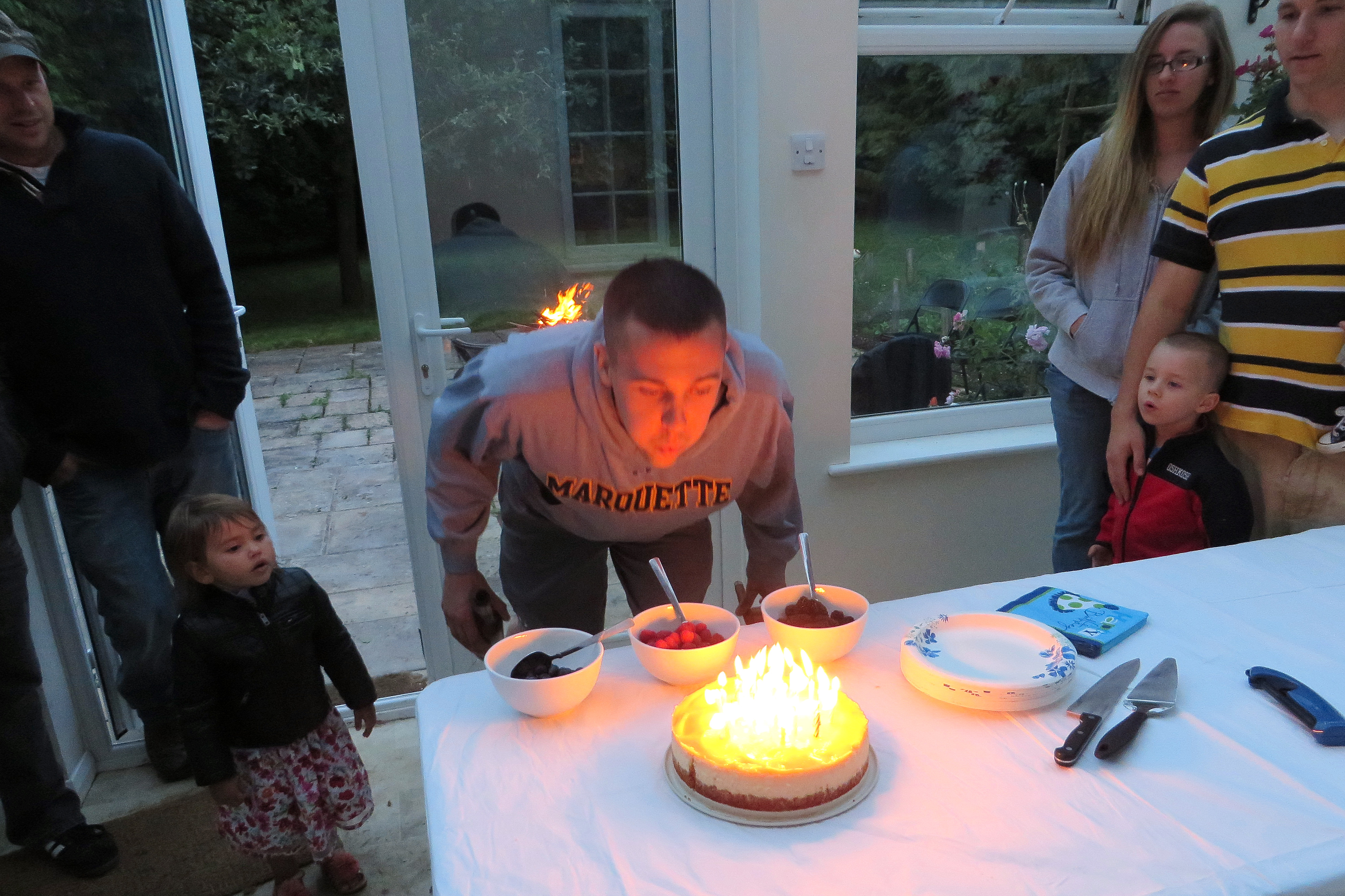 Andrew made his grandma’s cucumber dip, and that totally made my day. I could have sat with a bowl of that and just been a happy little pregnant person! Andrew’s pork shoulders sat on the grill for 12+ hours and made some delicious sandwiches — everyone loved them! We also made some mac & cheese and German potato salad, and some of our friends brought over coleslaw, chips and dip, and a cake. My lemon cheesecake turned out beautifully (if I do say so myself), and everyone seemed to really enjoy it. The weather wasn’t exactly “summery,” which was surprising for mid-August, but we stayed cozy by the fire after the sun went down. Happy birthday, Andrew, I love you!