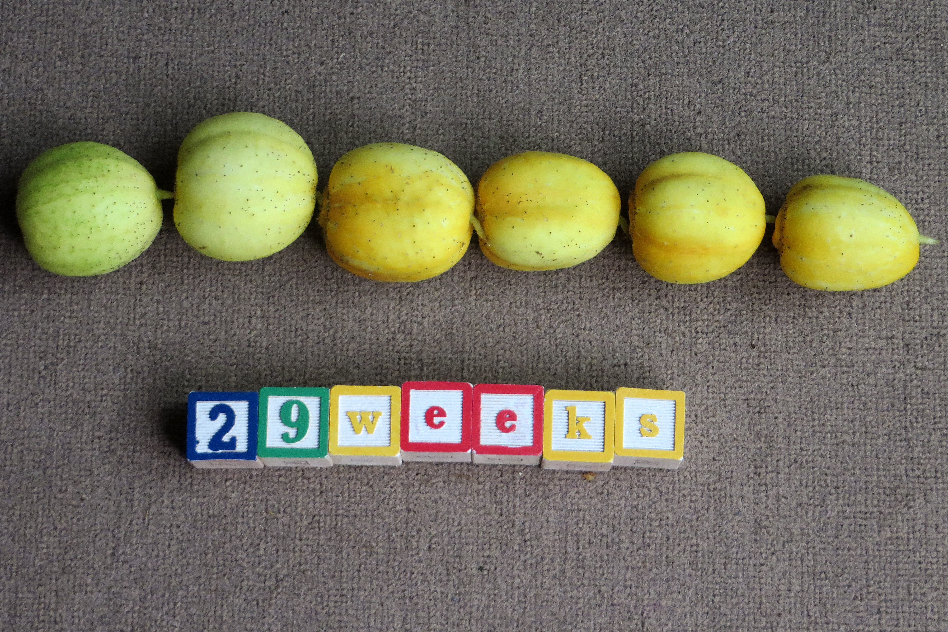 29 weeks and Baby Kiel is as long as 6 lemon cucumbers. In other words… 15.25″ long and 2.75 lbs! Yes, I am running out of ideas for these pictures, haha. But then I looked at the kitchen table and saw this: