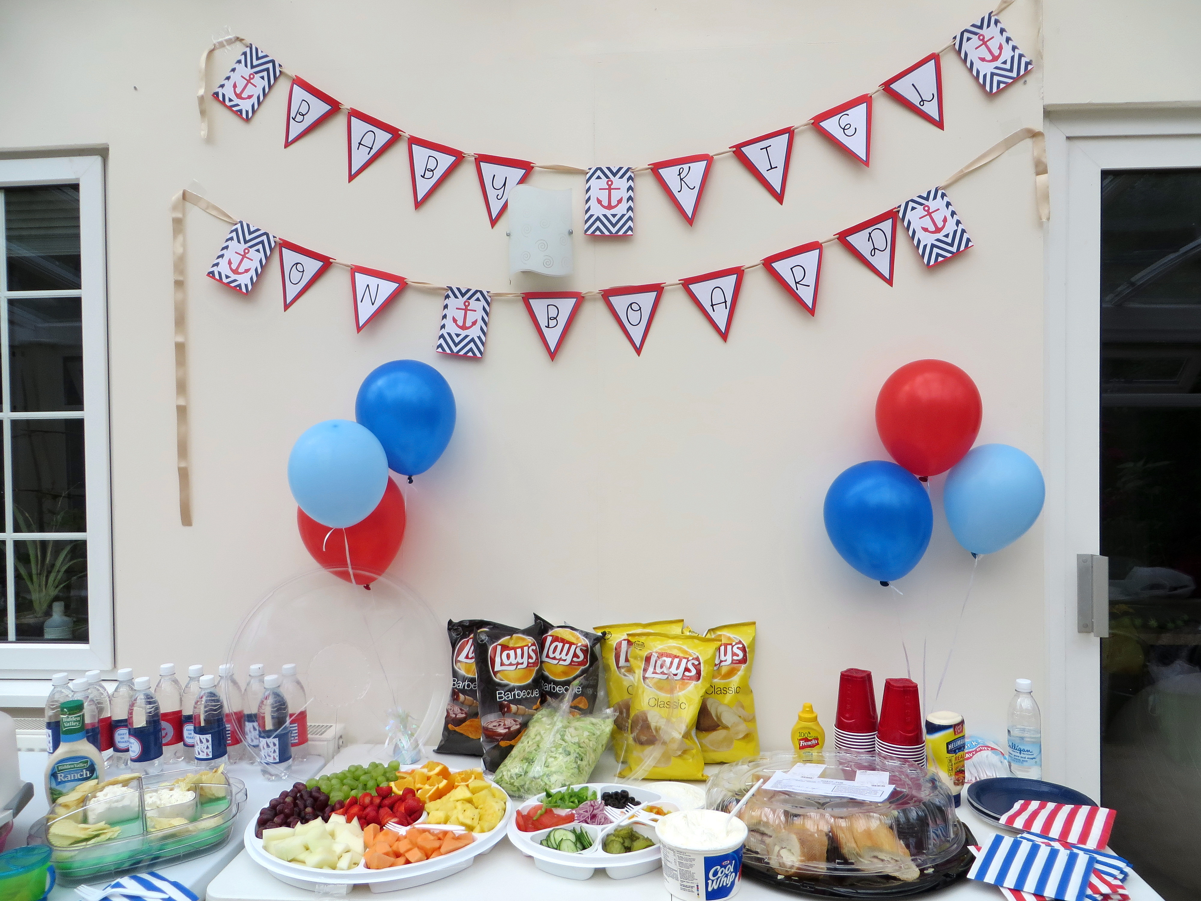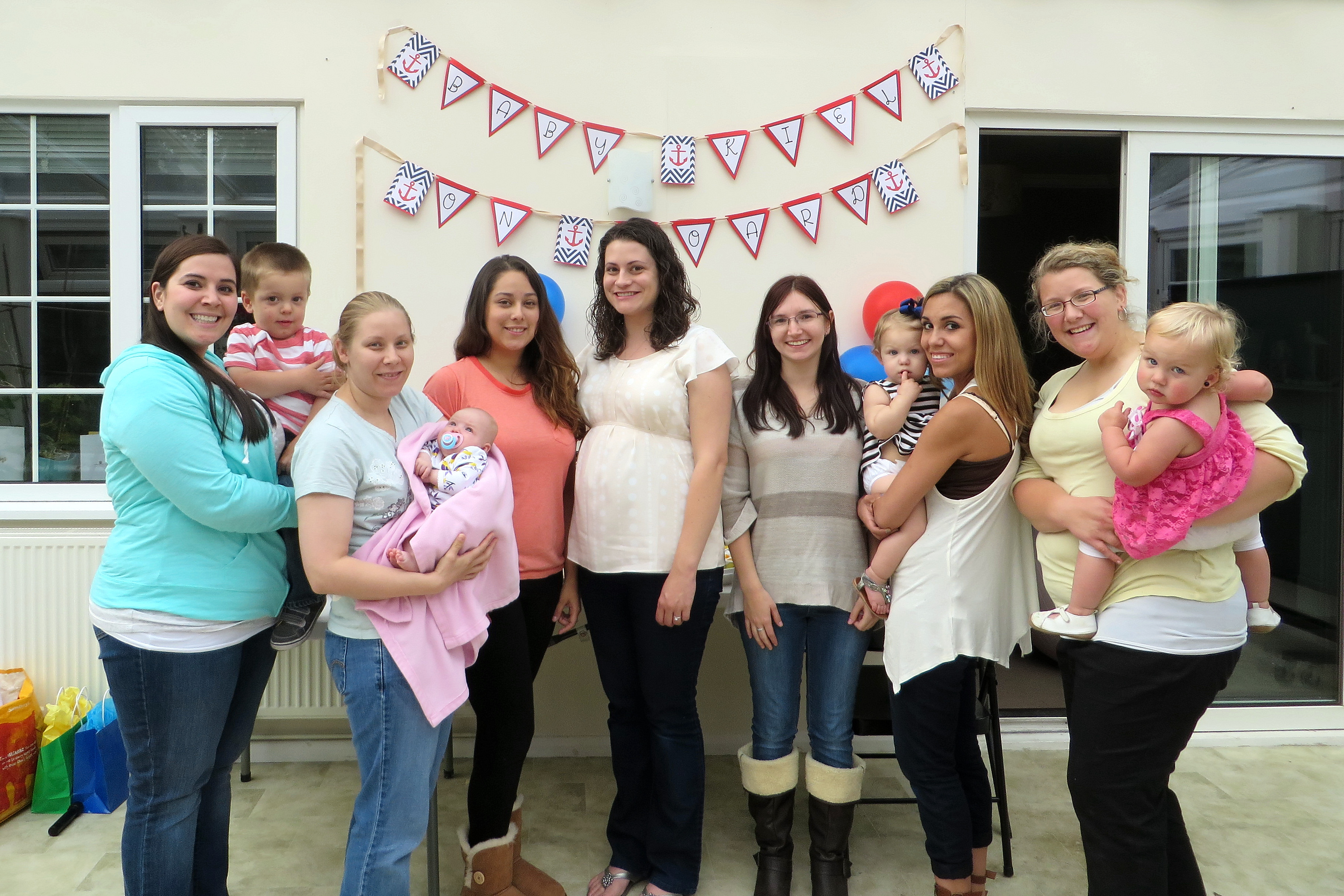Best moment this week: A SURPRISE baby shower! I knew there was talk of a shower being planned by the girls I work with, but no one ever asked me about a date or anything. Andrew and I went on a completely normal weekend errand, so nothing suspicious there. But as we approached our house on the way back, I saw cars parked on the road… and then more in the driveway. Andrew sent me to the backyard to check things out (I probably looked really nervous), and there was a cute nautical-themed shower set up!