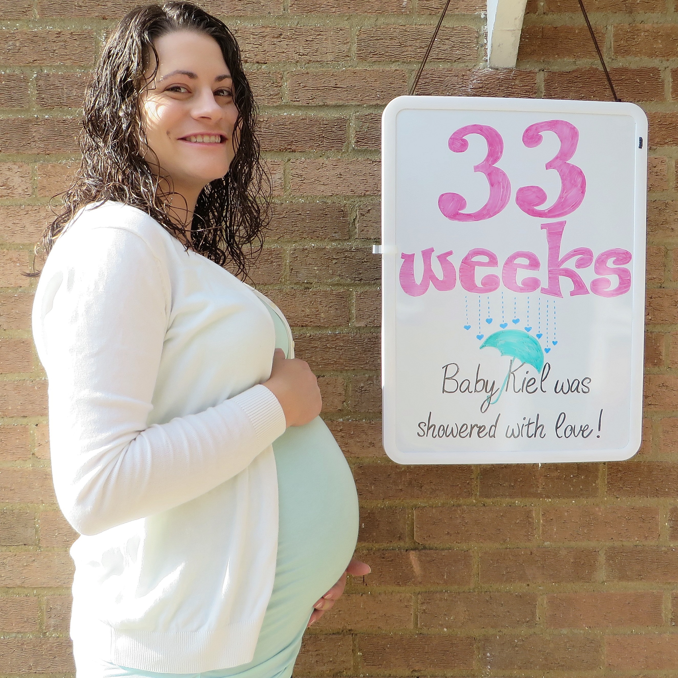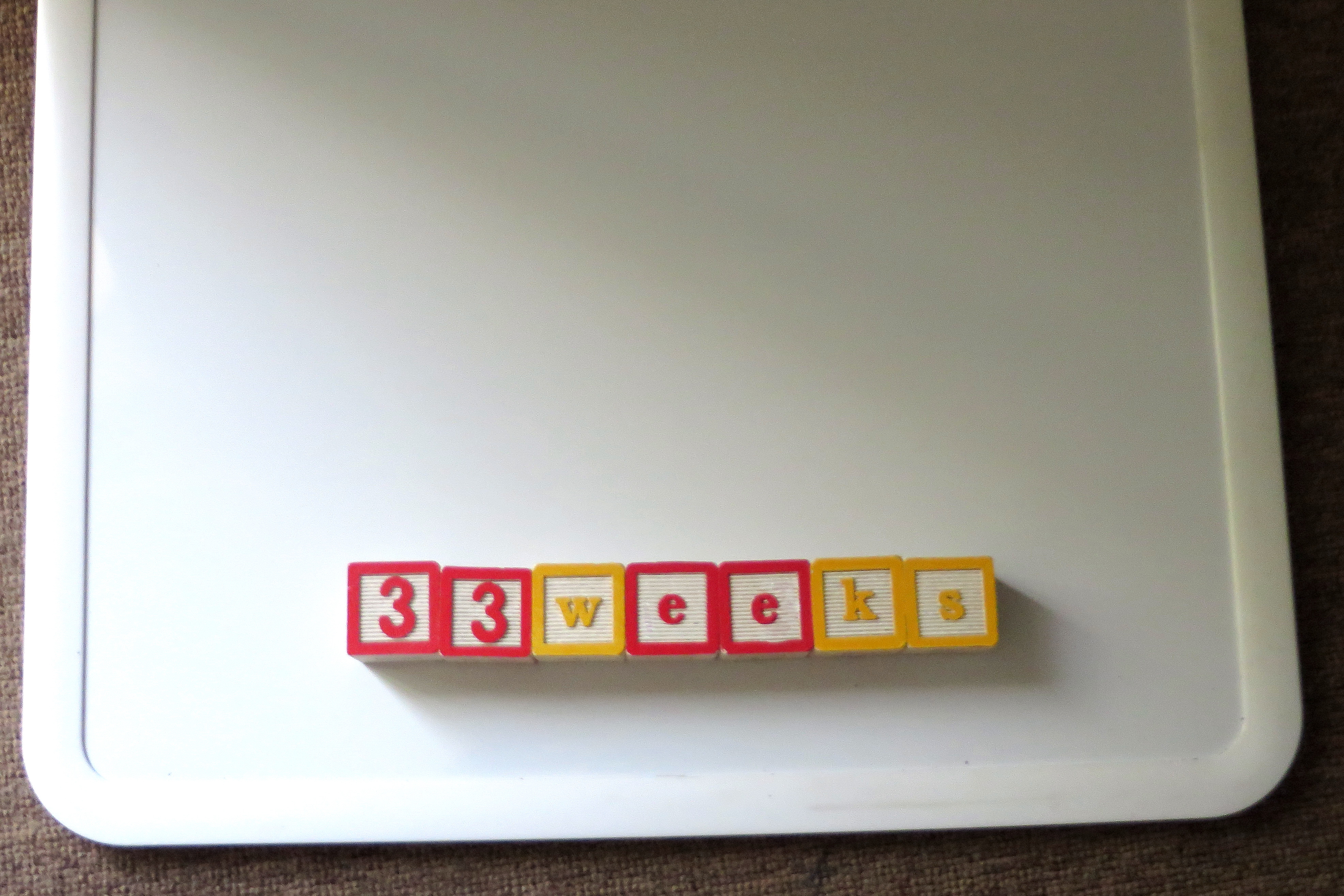 Baby Kiel is now the length of the week-by-week whiteboard we have been using! The short end of it anyway. 🙂 He or she is about 17.25″ long from head to heel and weighs about 4.25 lbs. My amniotic fluid level is at its maximum at this week, while Baby Kiel will keep growing and growing. Our little one has his/her own immune system now, although it’s still developing. Not that I’m expecting an early arrival, but we will be full-term by the end of this month — can you believe it?!