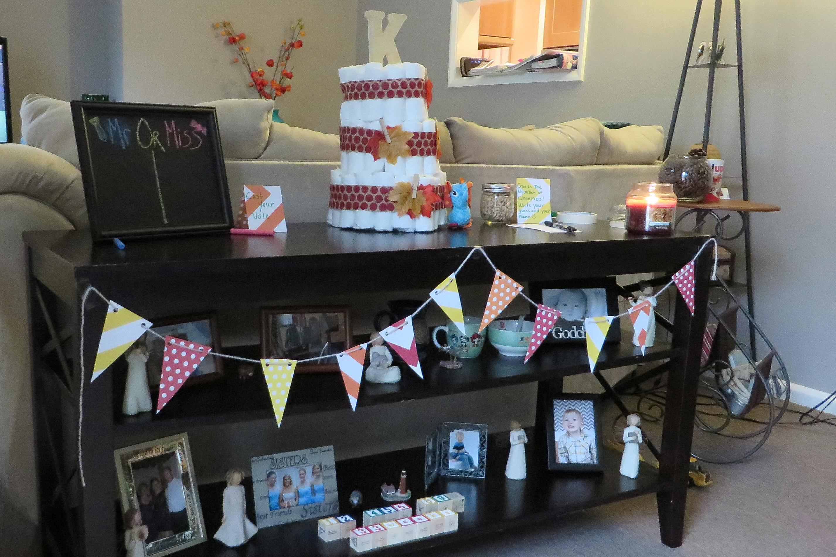 Last weekend we had our co-ed BBQ baby shower at our house. My friend Diane hosted it and did such a cute job with a fall theme. Everything was autumn-colored, including the diaper cake. I loved the little bunting too!
