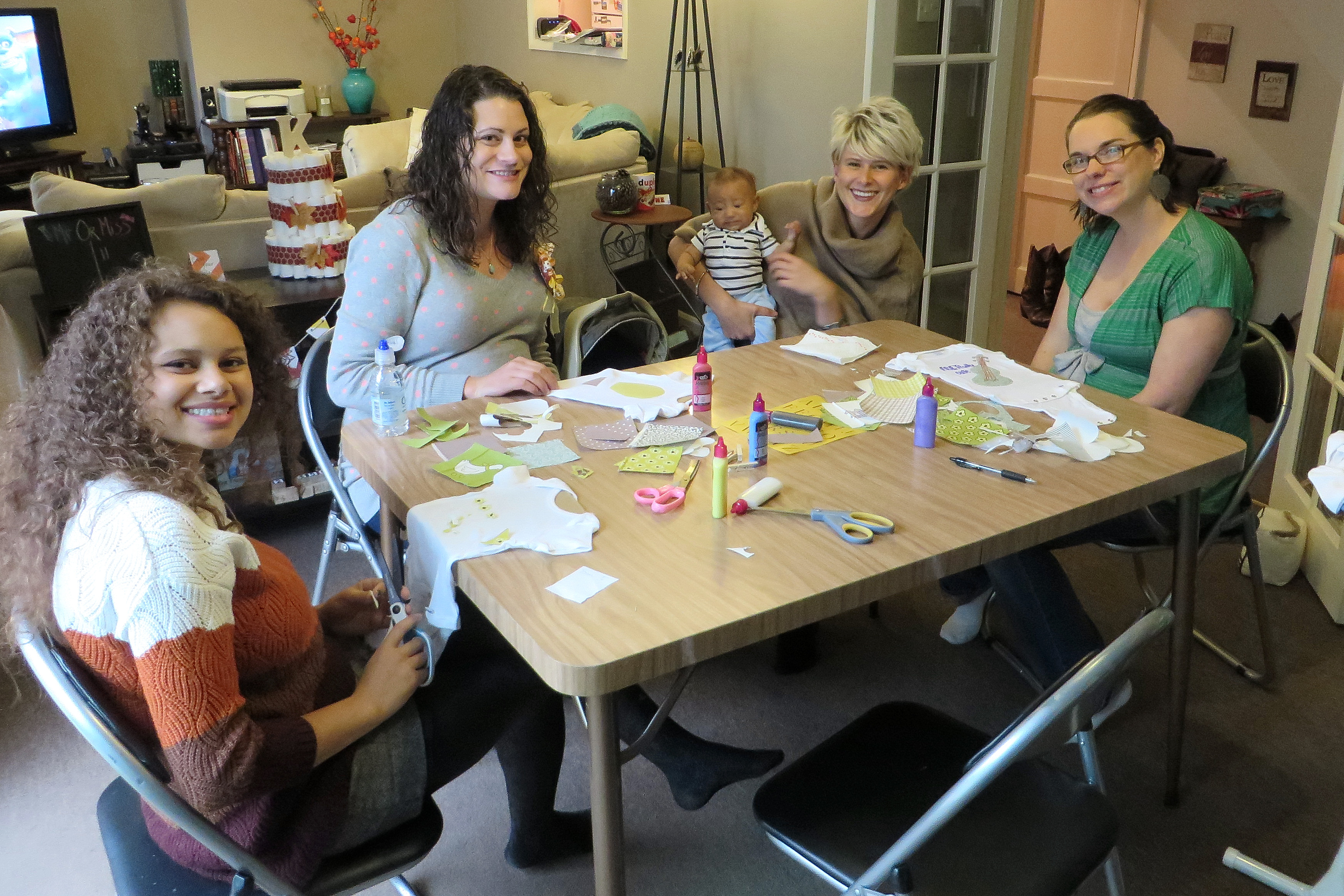 While the guys hung out and drank beer, us ladies decorated onesies. Diane had iron-on fabric and fabric paints for us to use. Once I got started, I just kept going — I think I made 3 of them!