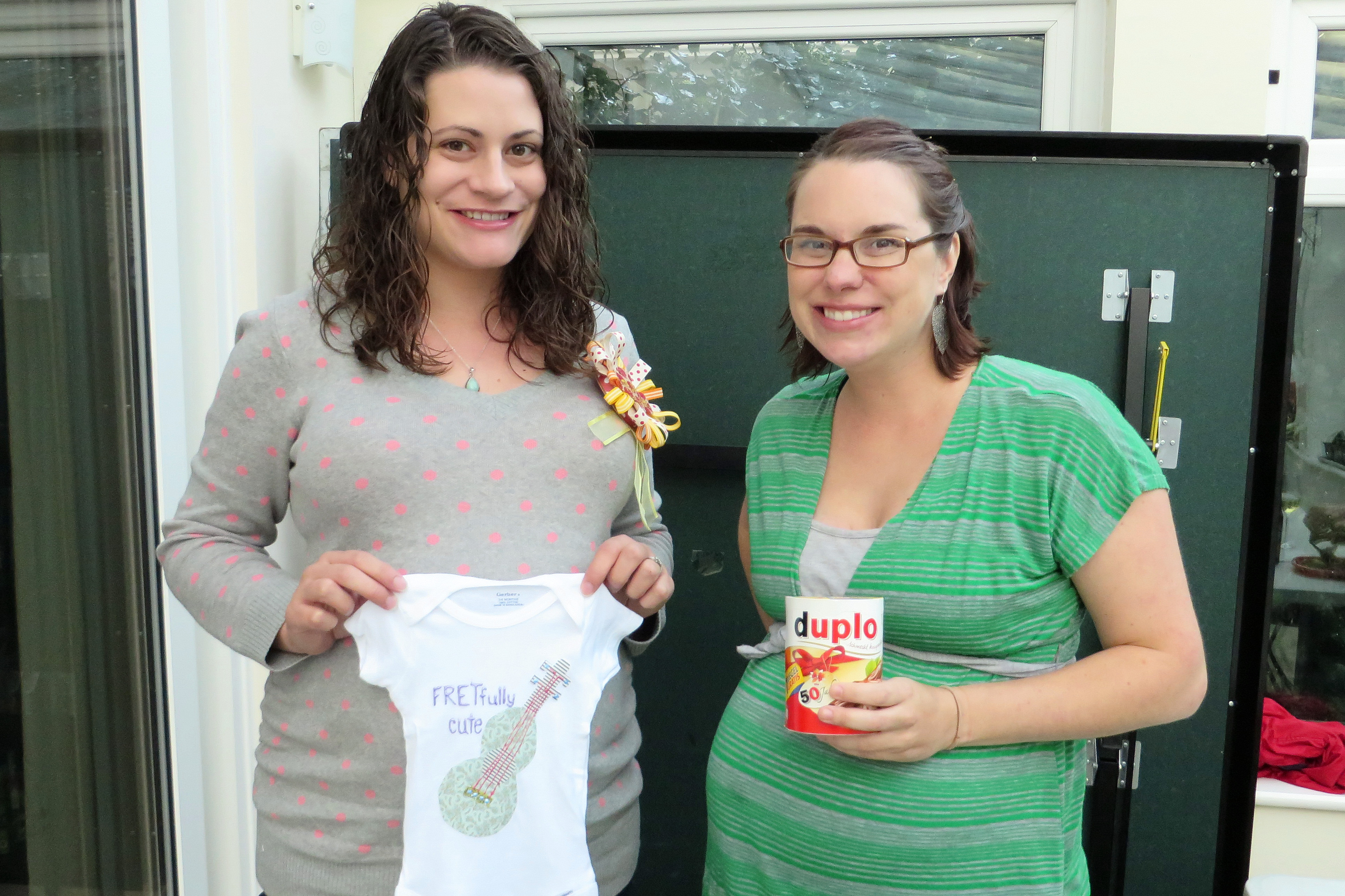 My friend Robyn won the onesie decorating contest! She made a guitar and wrote “FRET-fully cute” — I thought it was so clever. π And guess what else. We have the same due date! How crazy is that?