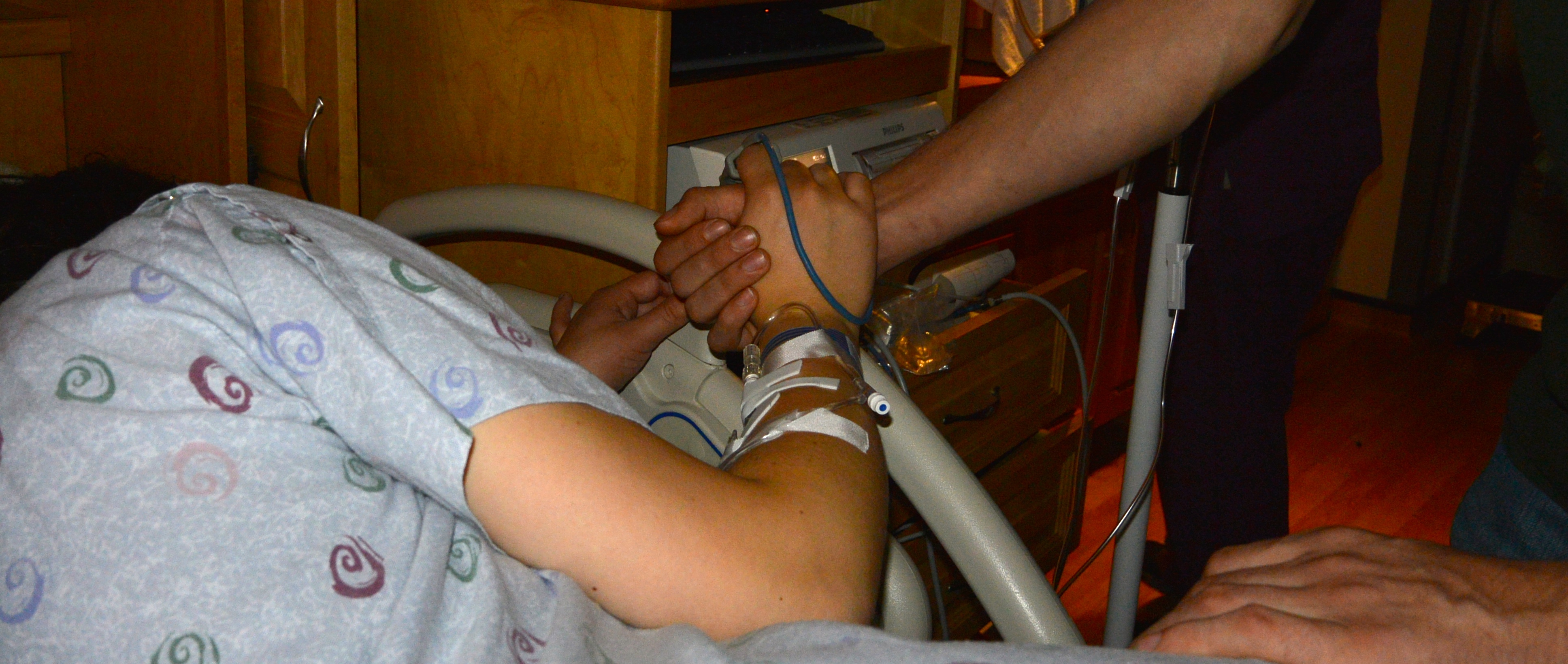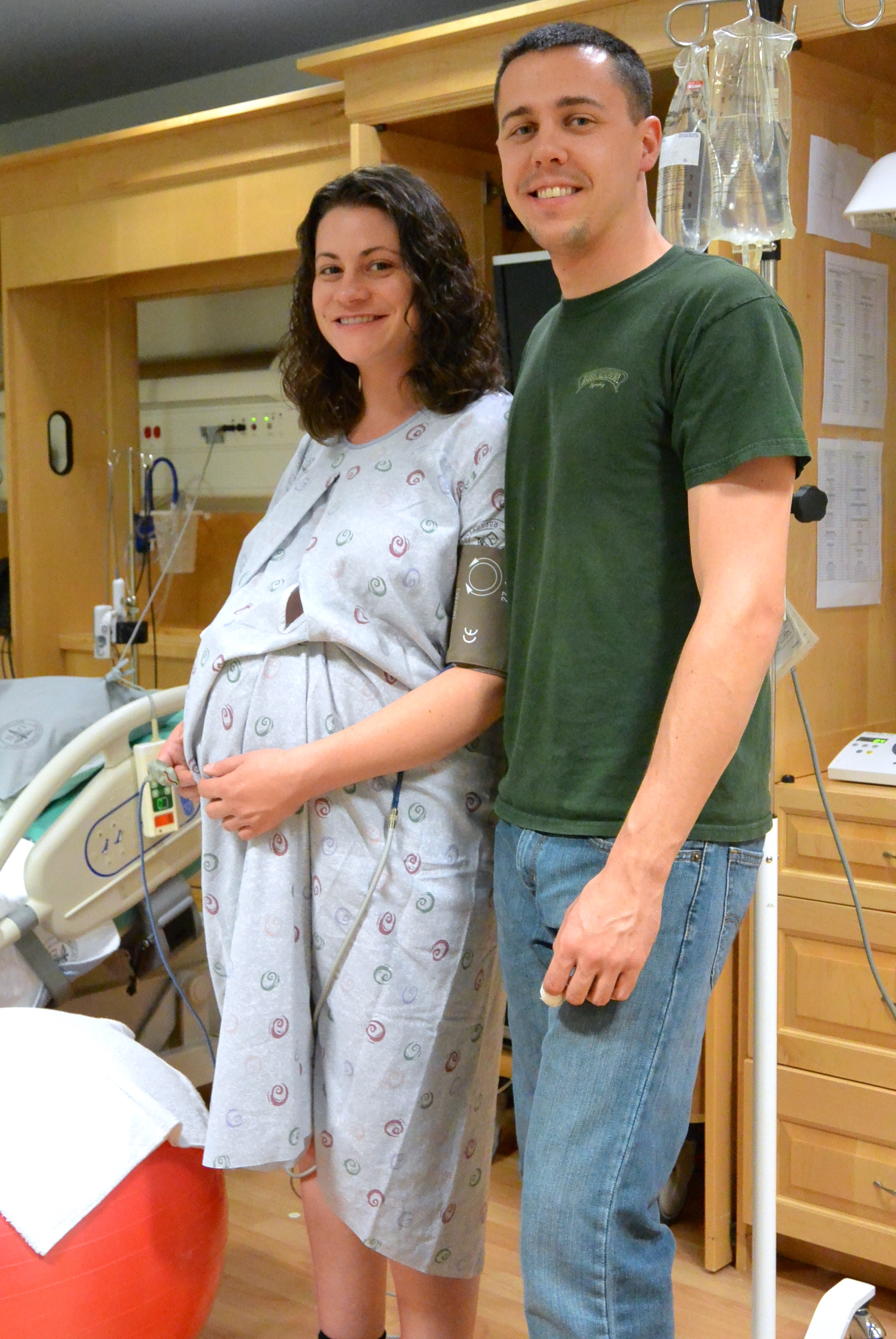 I was wrong. Luckily, I didn’t leak more fluid in the car, but I sure did at the hospital! When I was examined around 7pm, they said I was only 1 cm dilated. I wasn’t feeling any contractions, so they suggested starting Pitocin. We called our doula, Susan, and she came to talk with us and try to induce labor with pressure points on my feet. We ended up starting a low dose of Pitocin (level 2) around 10pm. Ben brought us some of the dinner they cooked at our house, and I was given permission to eat until midnight, so I scarfed that down. I was hungry! Then it was time to try to sleep. A little difficult when you’re anticipating having a baby, and when nurses come in to check your blood pressure, heart rate, and temperature every couple of hours. Needless to say, I did not sleep well or much.