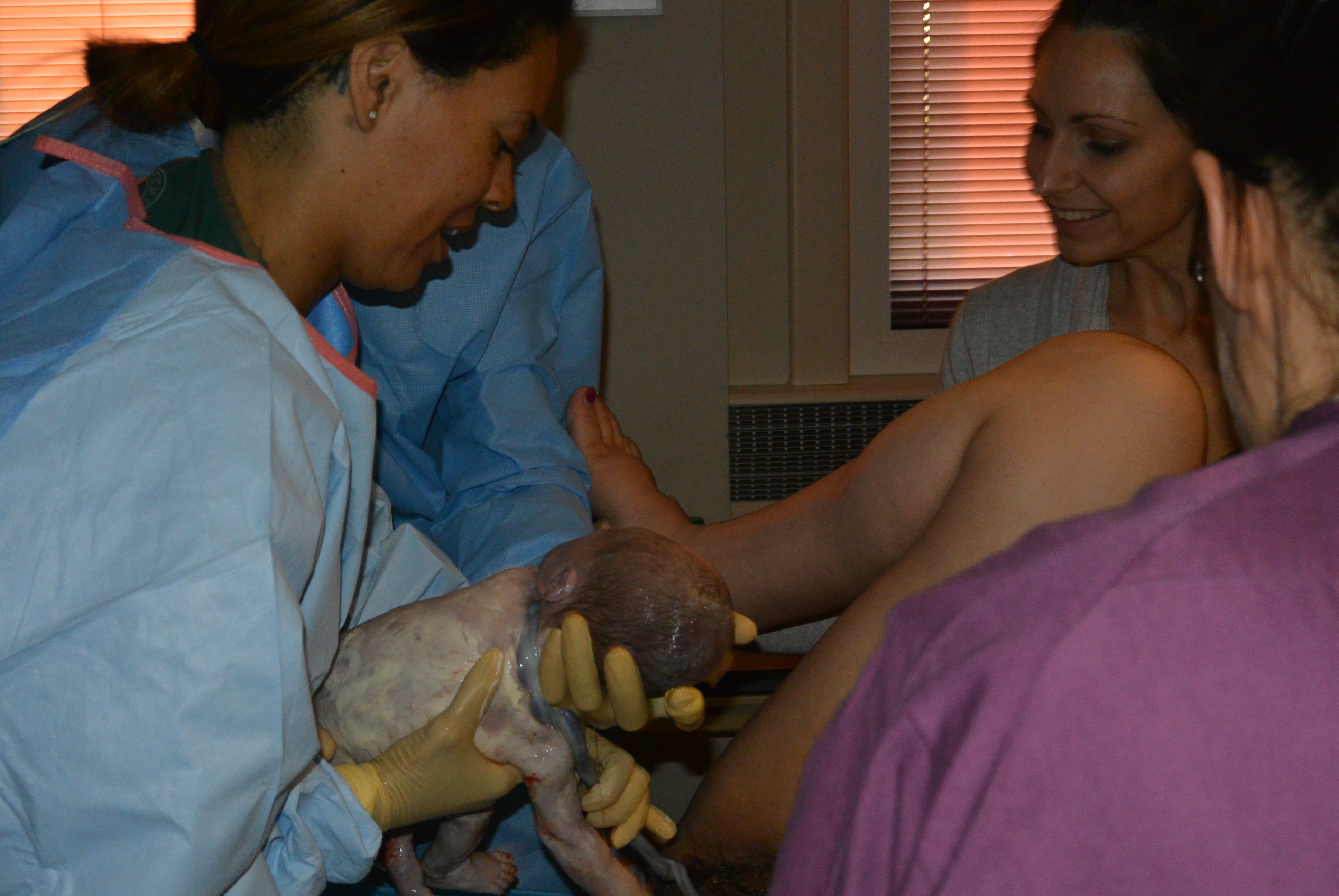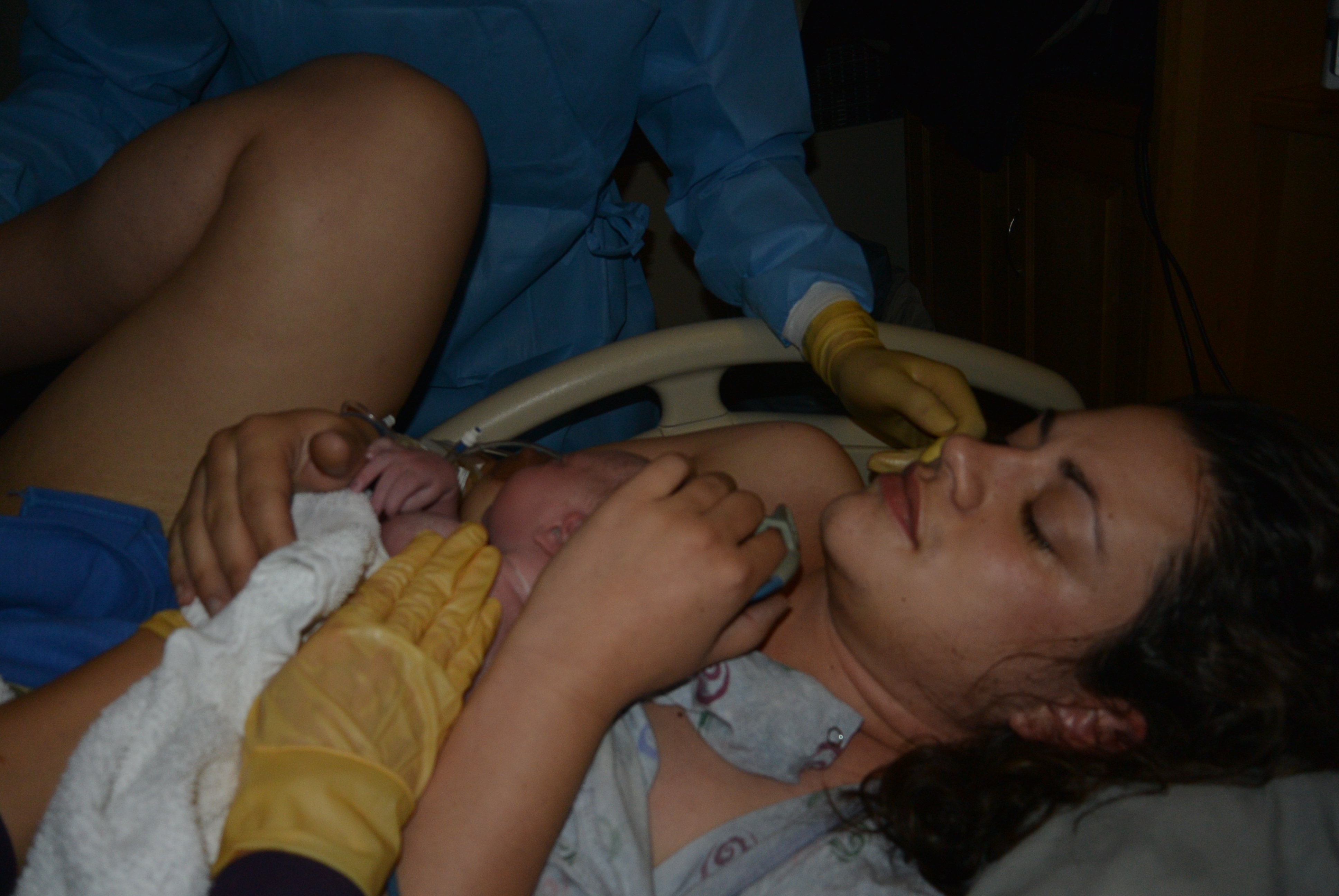 I started pushing around 2pm. I felt like I wasn’t making much progress for awhile. Someone was not ready to come out anymore, haha. And once I was laying down for that check, I wasn’t about to move again. I was tired and in pain, and I couldn’t consider moving. So the rest of the pushing happened with my laying on my side.
