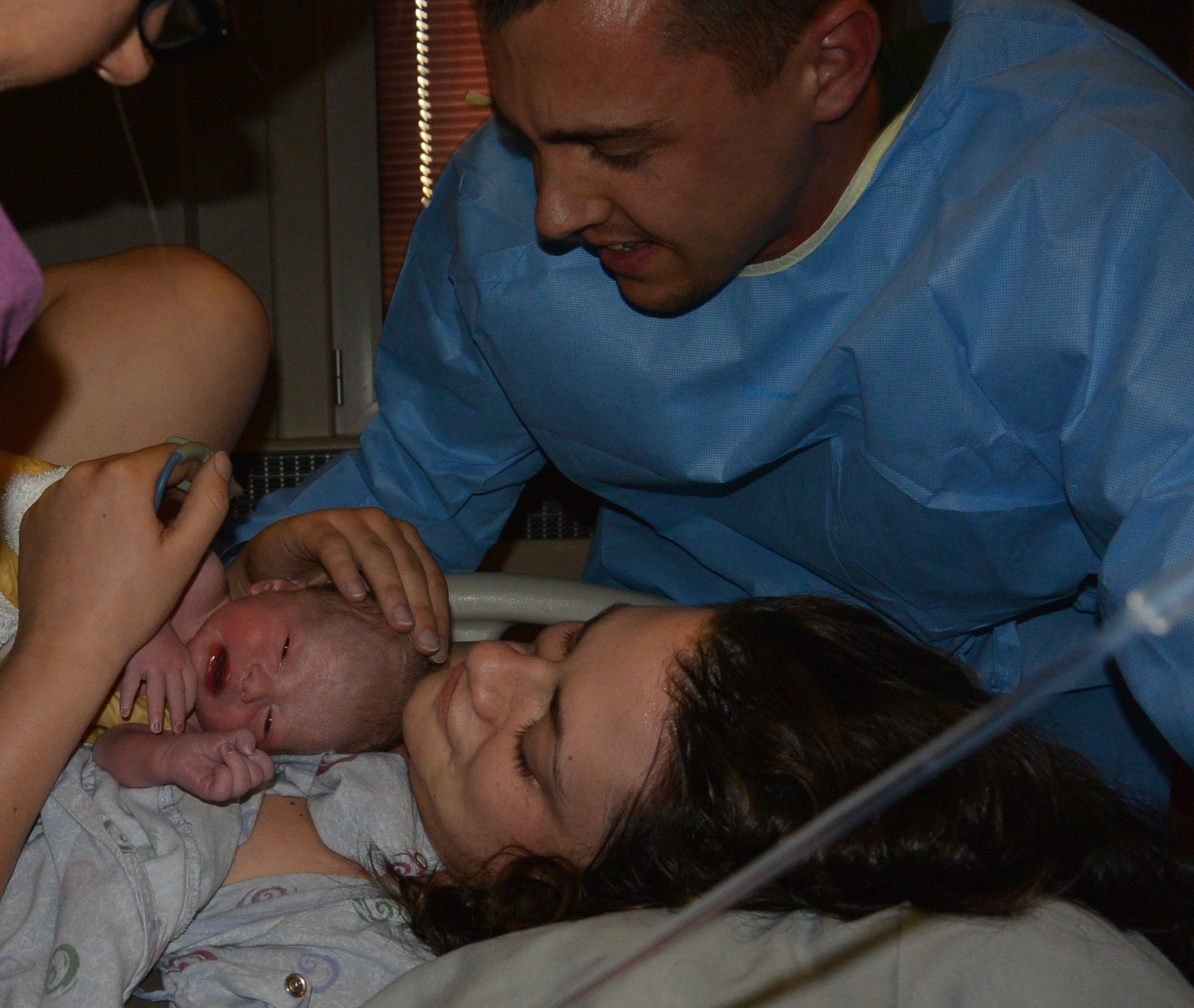 I wouldn’t say I was comfortable in this position, but I wasn’t going to be comfortable in any position. All my pushing slowly moved Gerrit down to the birth canal. He was not at the right angle for awhile, although I have no idea how long it took for him to move into the correct position. I had no concept of time during anything that happened once I was in that bed. Eventually, Gerrit was ready to go. The doctor told Andrew to get ready if he wanted to deliver!