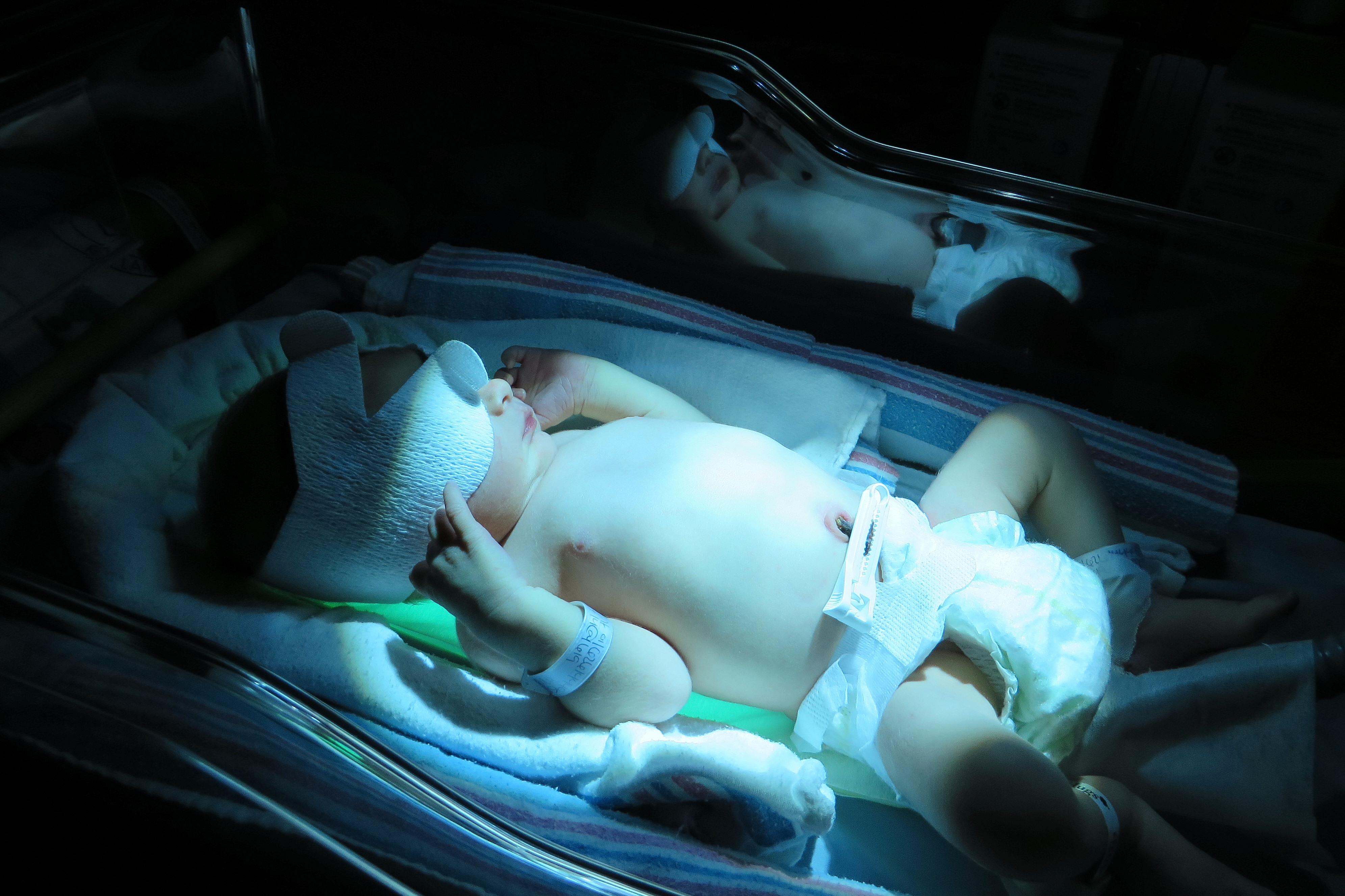 Gerrit had elevated bilirubin levels that required phototherapy. He would lay on the light blanket and also have lights shining down on him. He hated the lights in the bassinet, because he was most content being swaddled, and he was constantly trying to pull the mask off of his face. This resulted in him screaming. A lot. The nurses suggested a pacifier, which we didn’t want to use, because we were already afraid he was having difficulty breastfeeding. We ended up using bottles at home for a bit, so now I feel silly for resisting the use of the pacifier, although we still haven’t introduced one to him.