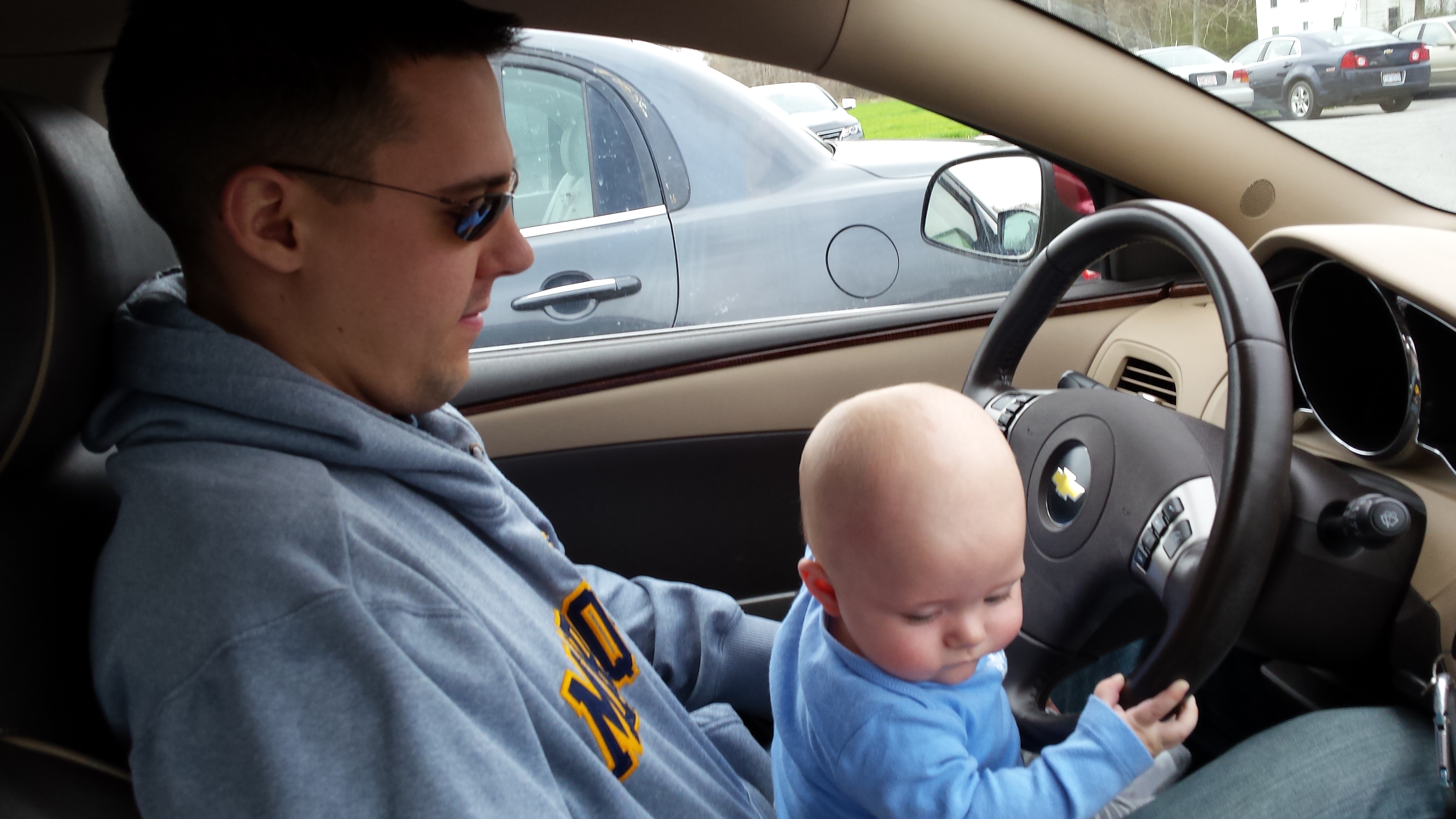 Just kidding… this is when we went to get the Hyundai (which was shipped over from England). We stopped for Gerrit to eat, and he sat with Andrew and played with the steering wheel for a bit.