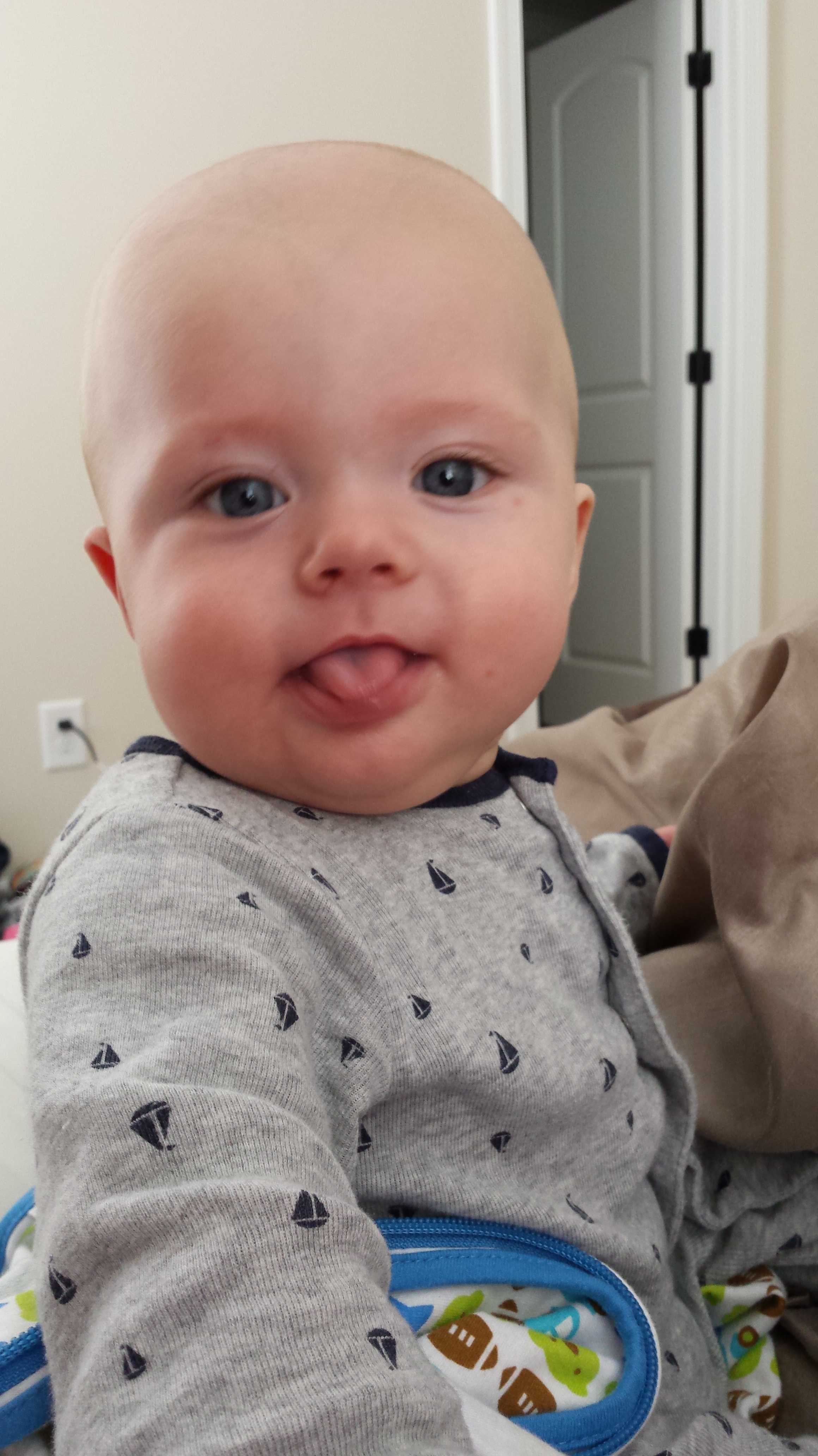 He started sticking out his tongue all the time and learned how to blow bubbles/spit. Sometimes it’s cute and funny… not so much when he does it while nursing. I’ve gotten sprayed with a mouthful of milk more than once.