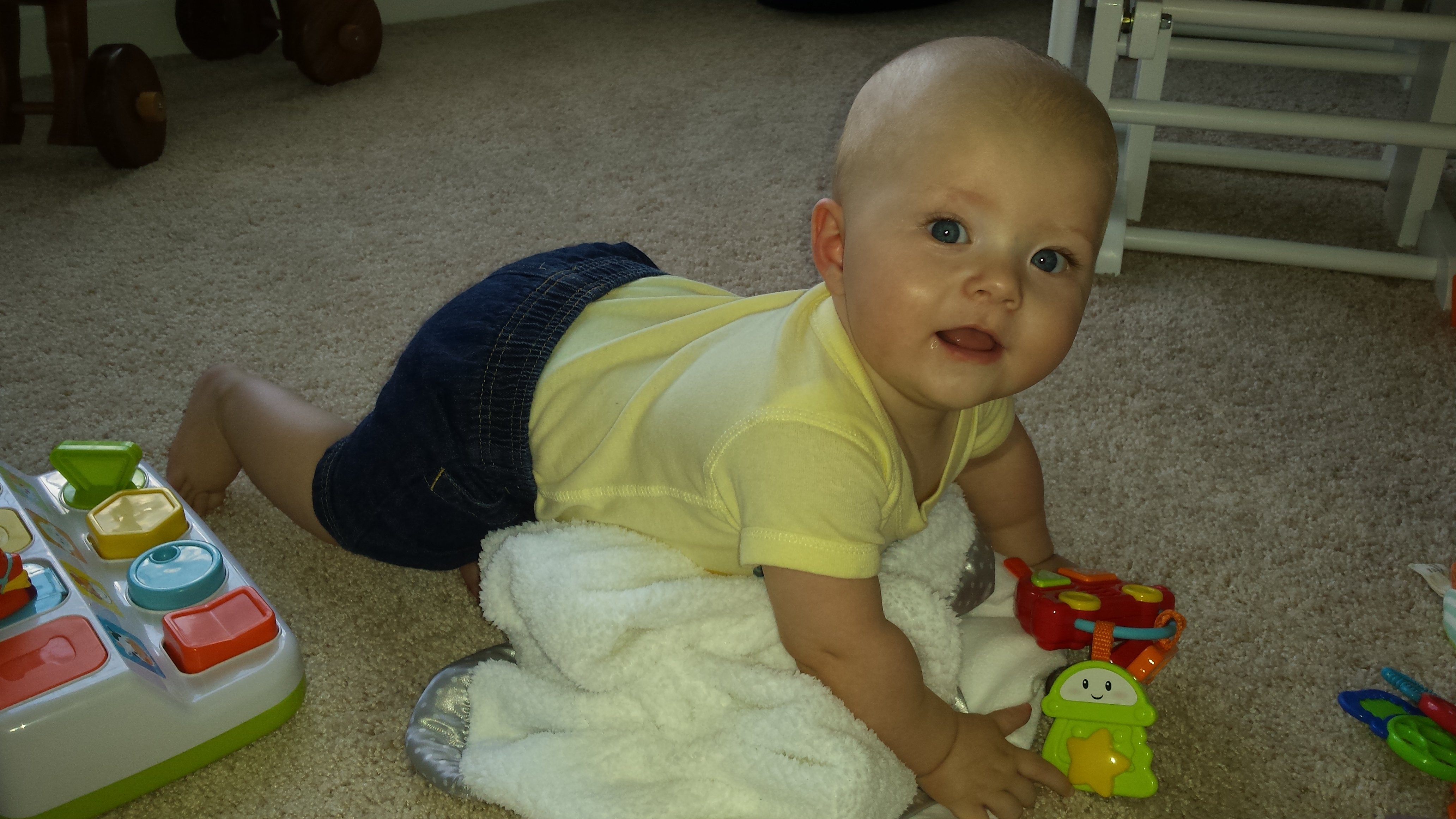 Gerrit likes practicing his crawling to some extent. He will get up on all 4s and rock back and forth, then drop down on his belly and try to move. He gets frustrated fairly quickly though.