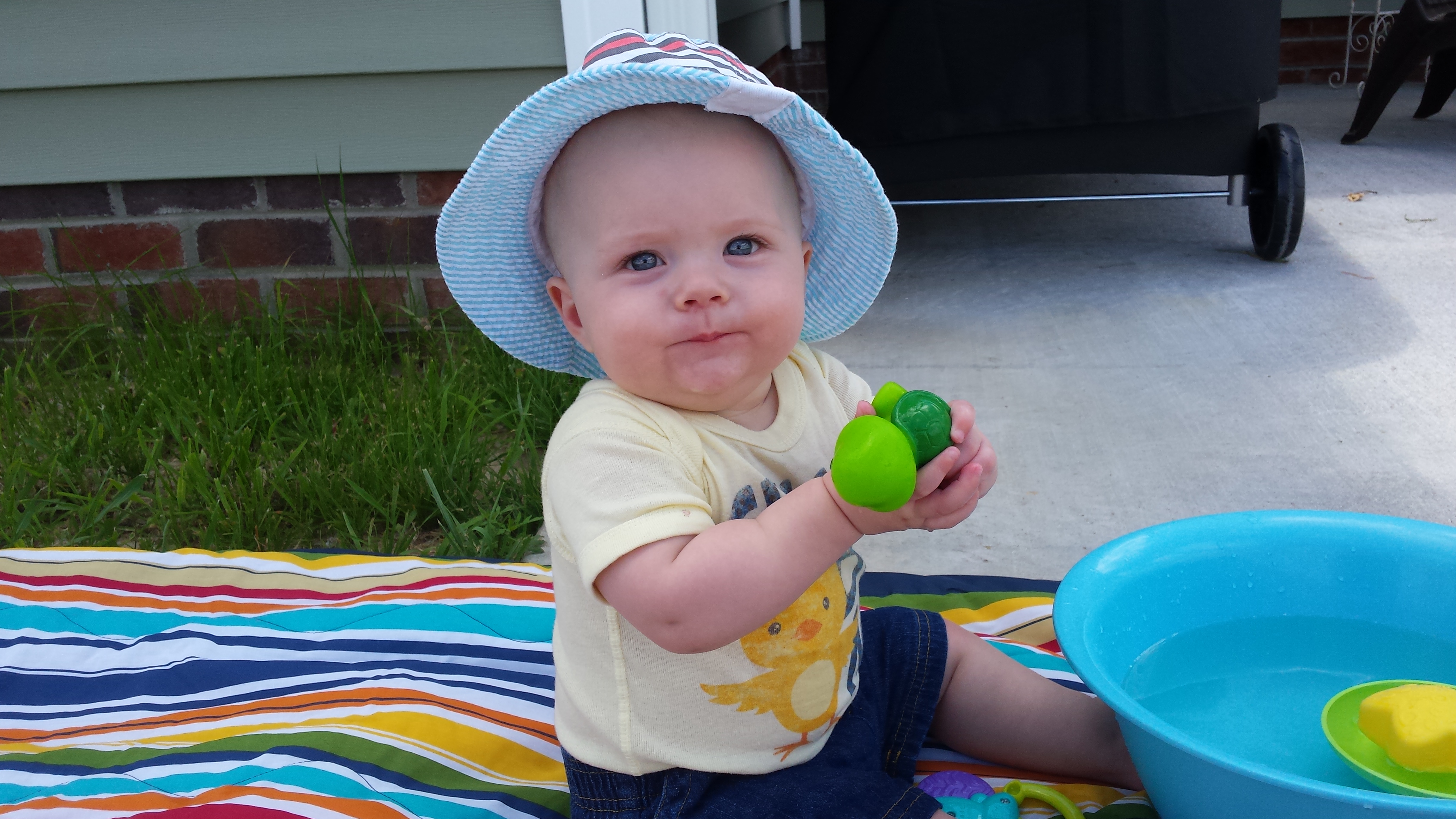 At night, Gerrit’s sleep ranged from no night wakings (can I get a hallelujah?!) to 5 night wakings (shoot me now), although 3-4 was the norm. His nights with only 1 waking were the nights he slept 6+ hours during the first stretch, 7+ hours in a stretch, and then the night of 9.5 hours of sleeping bliss. That amazing night was June 17, and I keep waiting for a repeat of that night. 🙂 It was about a week after that that Gerrit was probably teething, so I shouldn’t be surprised that he was a bit more restless.