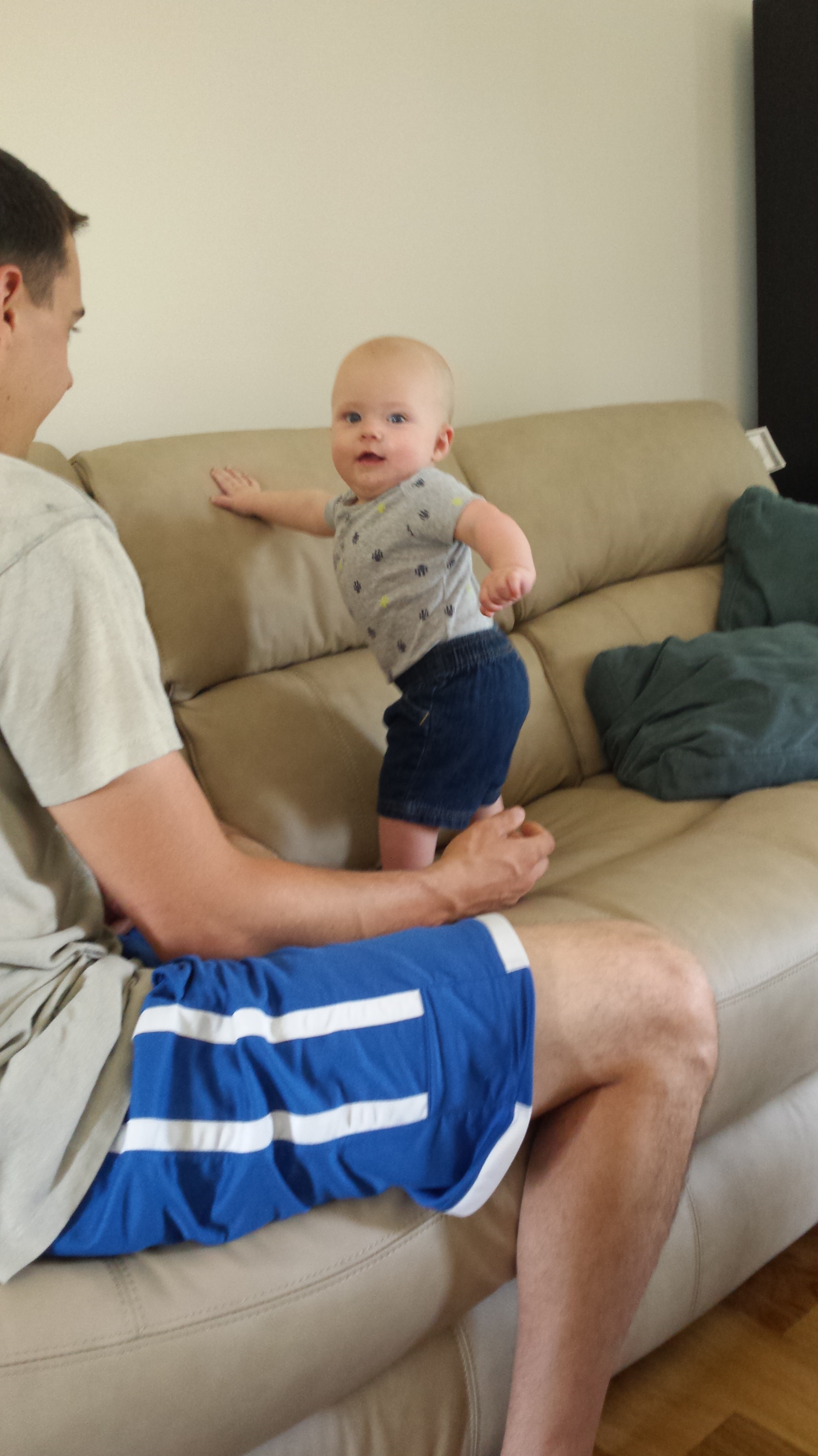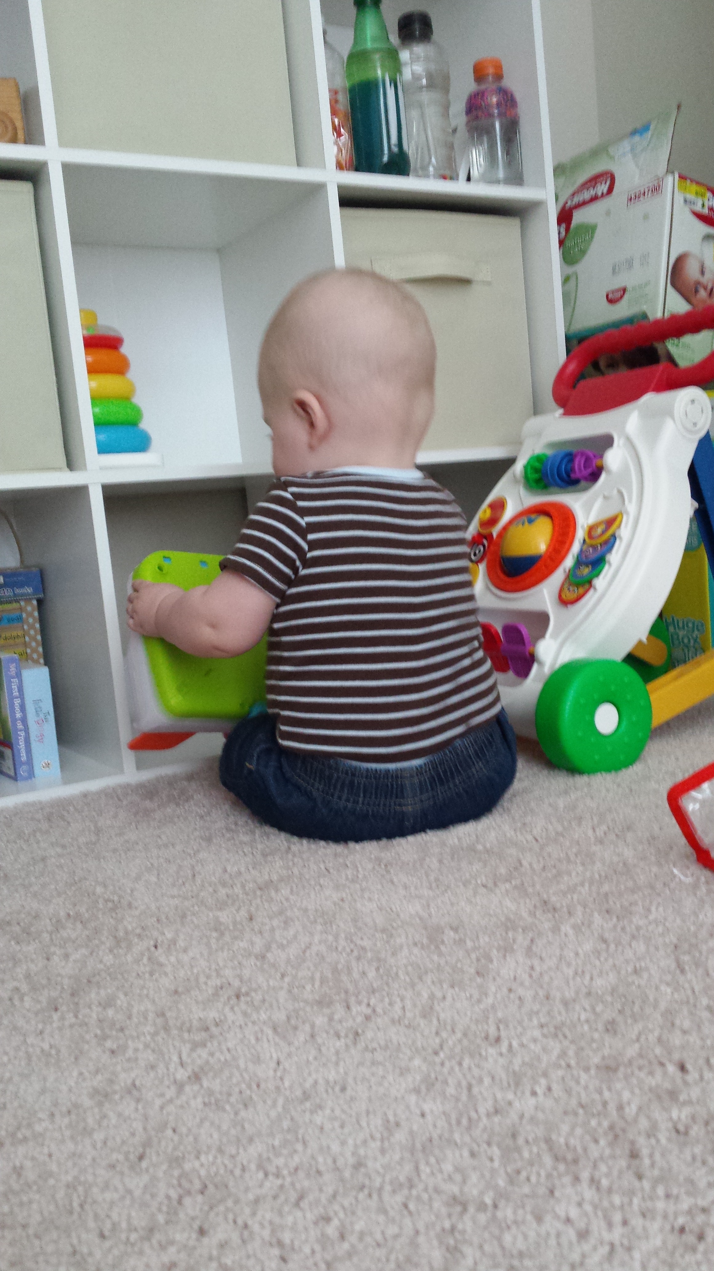 He also dislikes when you don’t help him walk around when he wants to! I’ve tried letting him try out his walking toy, but he doesn’t have the balance for that yet. So I’m usually either stuck with sore knees or a sore back from helping him walk around the house.