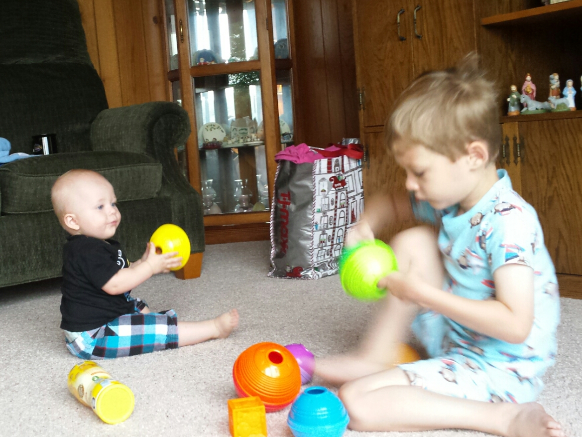 Gerrit is playing with one of his favorite toys in the photo above with his cousin Kaiden. Here’s a link to it on Amazon. He started out just enjoying looking at the different sized cups, but he’s starting to try to stack them now. My favorite thing about this toy is that there are several ways to play with it, and I think he will be able to enjoy it for a good amount of time.