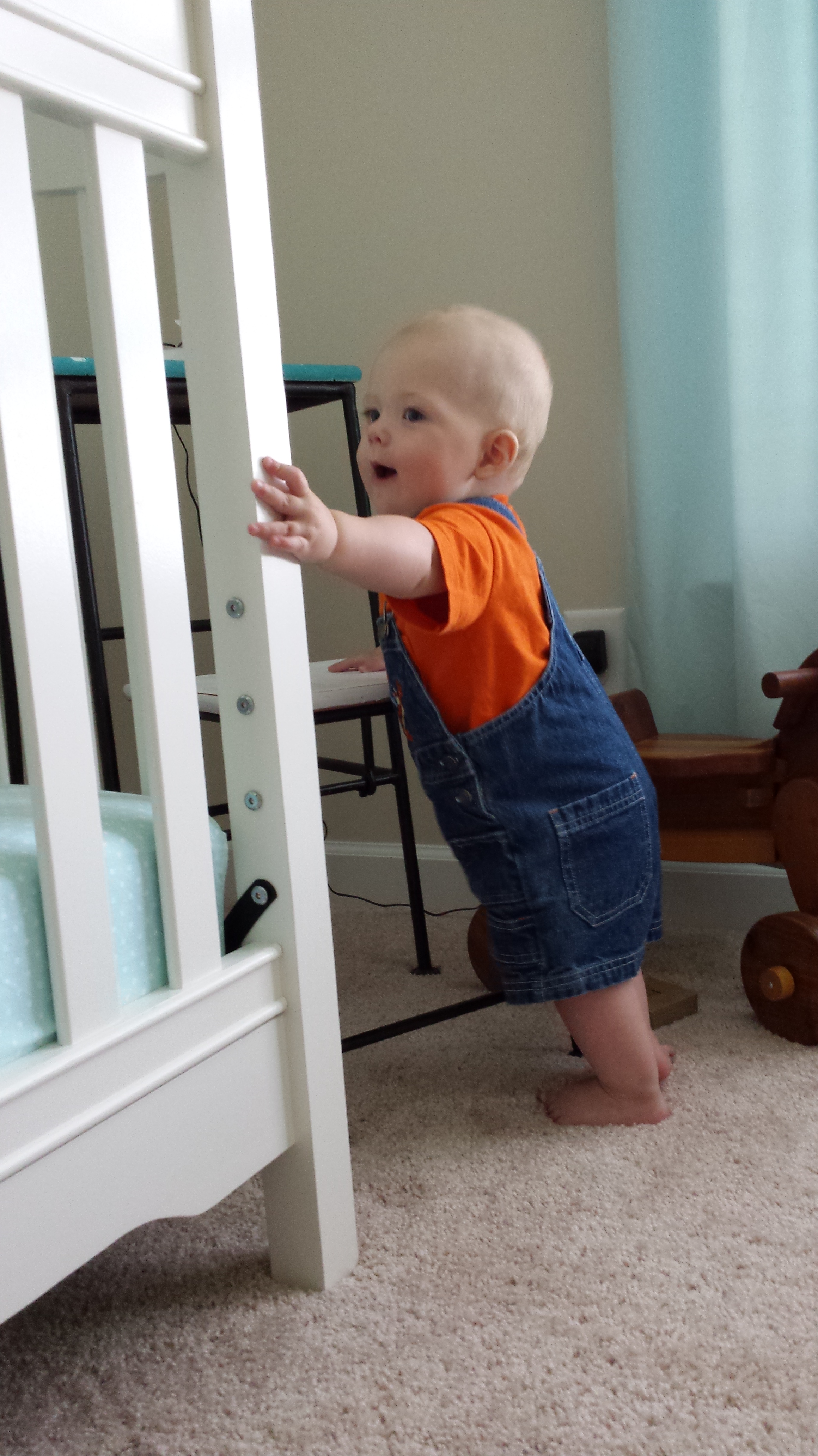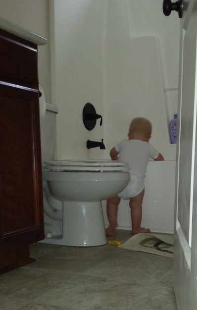 Gerrit also loves getting into things! The biggest issue is keeping him away from cords. I’ve had to block off lamp cords in the living room and the cords in our bedroom too. He also likes going into the bathroom and pulling up on the bathtub so he can push his bath toys in.