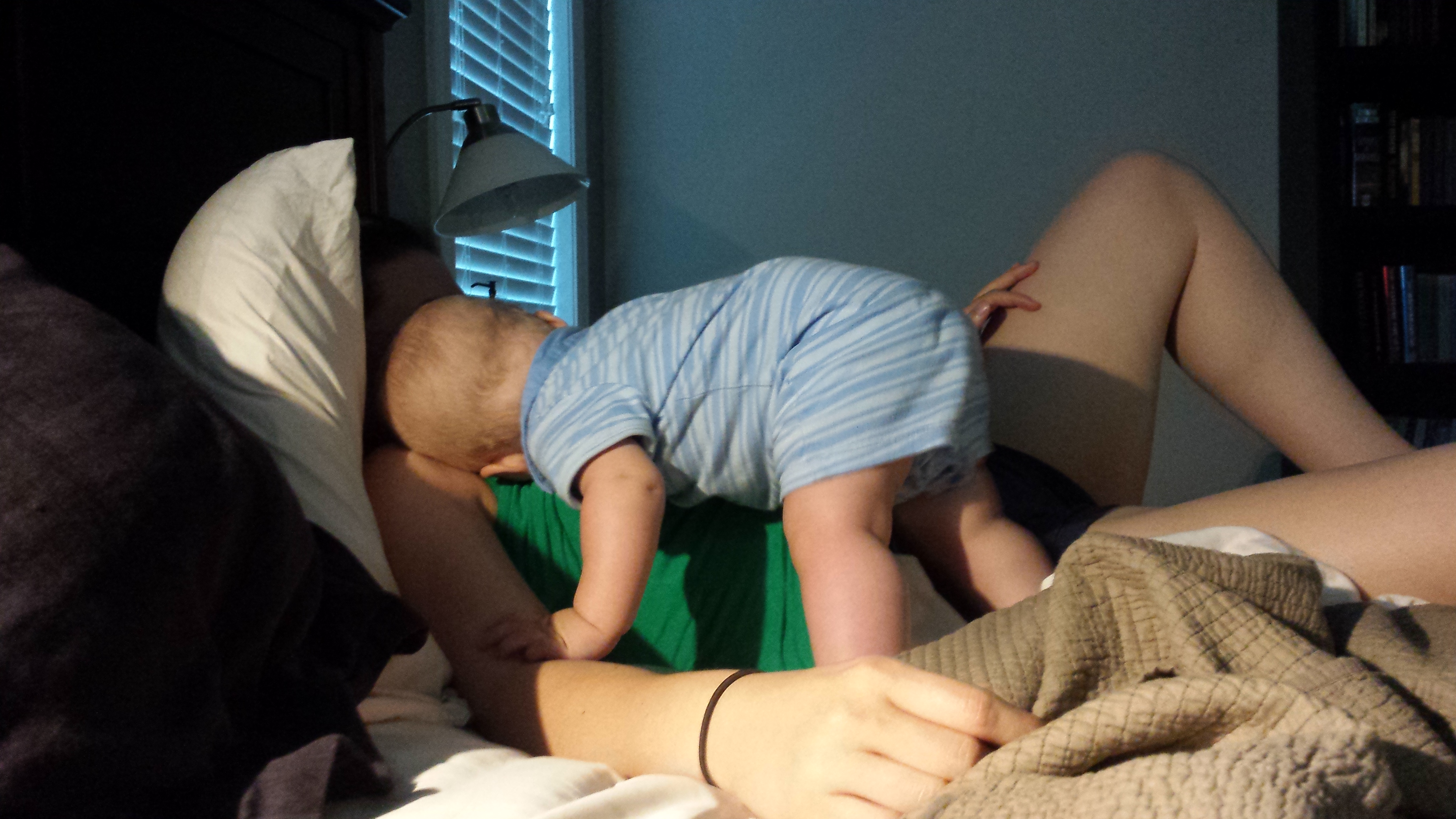 He also enjoys nursing in crazy positions now. He’s rarely content to let me just hold him to nurse unless he’s going to sleep. He likes to stand and bend over to nurse, lay across me, grab his feet and swing his arms around… it’s like breastfeeding a monkey.